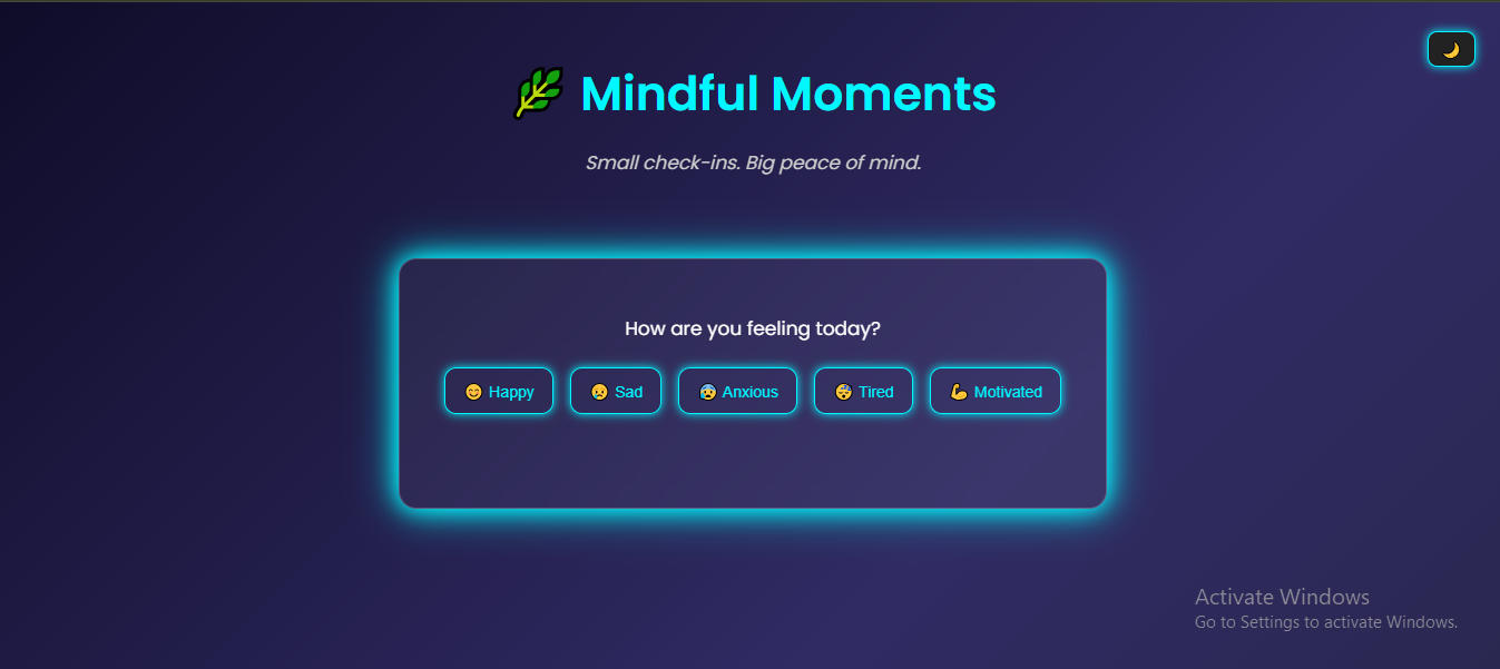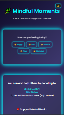 Mindful Moments is a simple, interactive mental health check-in website. It allows users to reflect on how they feel by selecting a mood — like happy, sad, anxious, tired, or motivated — and then displays an encouraging message tailored to that emotion.