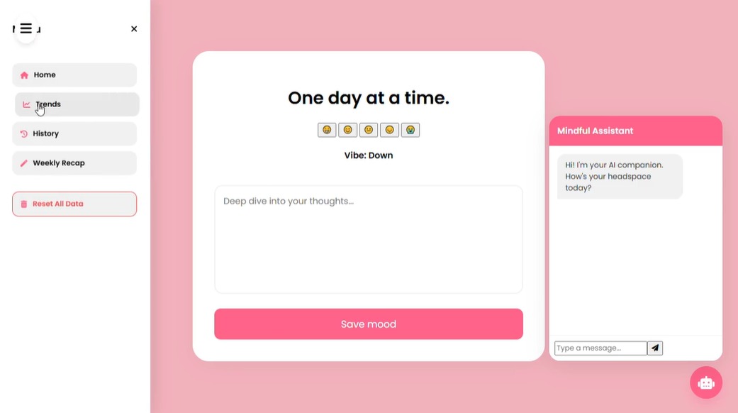 Mindful Companion is an AI-integrated wellness dashboard. It allows users to log their daily "vibe," journal their thoughts, and see their emotional trends visualized over time. Unlike a static journal, it uses AI to generate a "Weekly Recap" that identifies patterns in the user's mood and provides a 24/7 AI Assistant to offer immediate empathy and support when things feel overwhelming.