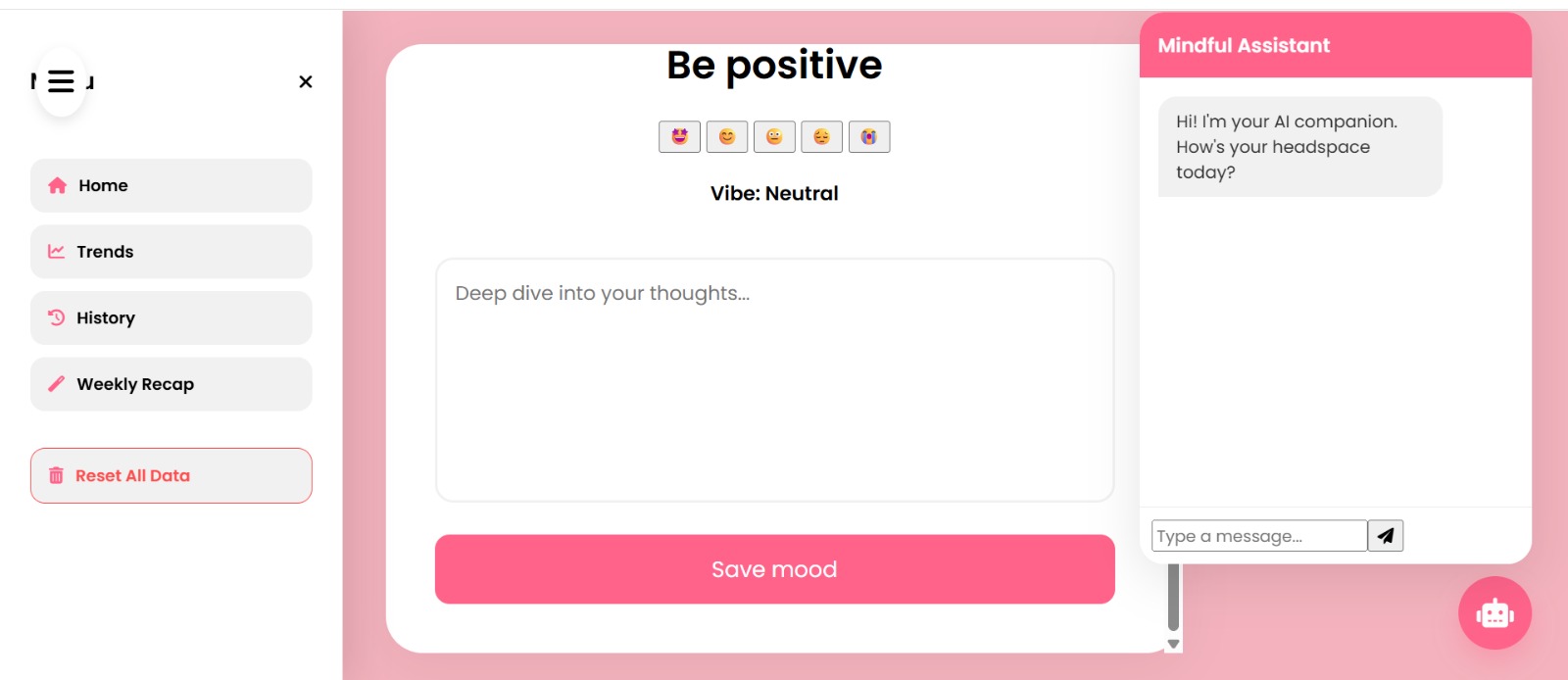 The frontend was crafted with a focus on minimalist UX/UI to reduce cognitive load, using a soothing pink palette. Frontend: [Insert Tech like React/HTML/Tailwind] for the responsive interface. Charts: [Insert Tech like Chart.js/Recharts] to map out the "Mood Journey." AI Engine: Integrated [Insert AI API, e.g., Gemini/OpenAI] to power the Weekly Recap and the real-time chat assistant.