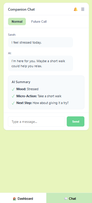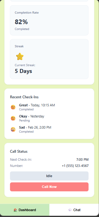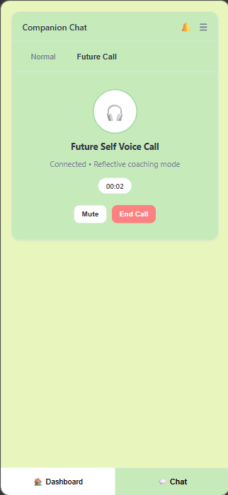 On the voice side, we aim to improve real-time call responsiveness and explore proactive check-in calls based on mood patterns and user behavior. We also plan to introduce reminders and smart nudges to help users stay consistent with their goals and habits.