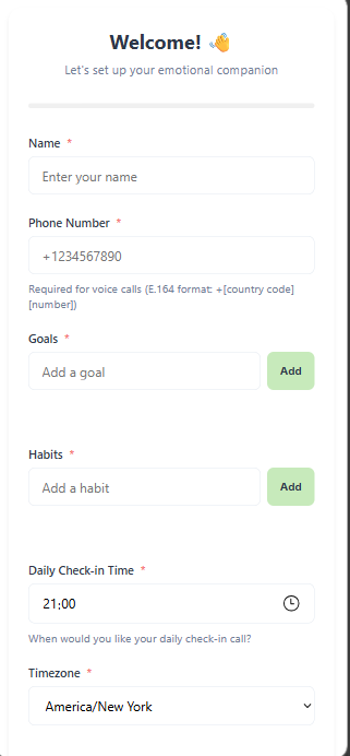 Our project is an AI-powered emotional companion designed to sustain motivation through consistent, personalized reinforcement. Users can interact with it through a dashboard chat interface, a browser-based voice check-in, or even a real scheduled phone call. Regardless of the mode, the system connects to a shared emotional reasoning engine that understands the user’s goals, habits, emotional history, and long-term patterns. When a user checks in, the AI analyzes their current mood and context, suggests a small and realistic micro-action, and asks a completion question to reinforce accountability. It never shames or overwhelms. Instead, it focuses on emotional grounding and small behavioral momentum. Over time, the system builds a memory of the user’s emotional patterns and progress toward goals, making conversations feel continuous rather than repetitive. The app essentially acts as the supportive friend that many people do not consistently have, someone who remembers what you care about and gently nudges you forward.