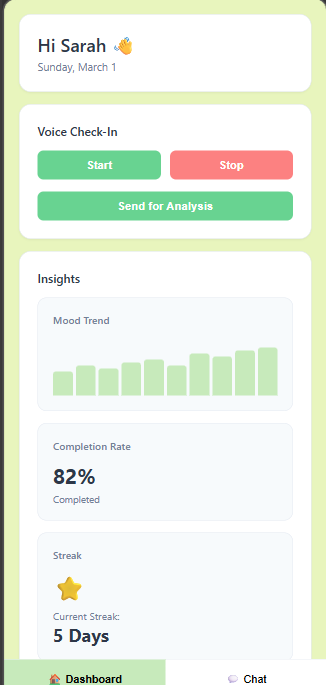 On the frontend, we built a responsive, mobile-first interface using HTML, CSS, JavaScript, and React (Vite). The dashboard allows users to track moods, log check-ins, view insights, and switch between standard chat mode and “Future Self” mode. We also integrated the Web Speech API for browser-based voice check-ins.
