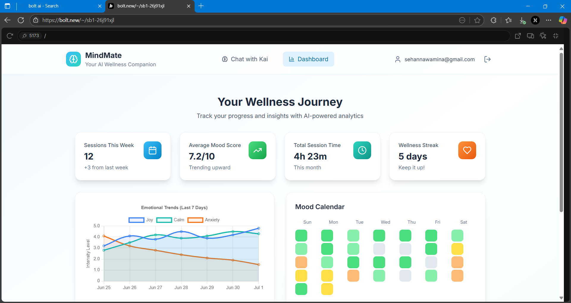 Challenges We Faced Integrating real-time emotion + speech APIs with Bolt.new’s interface Tuning LLM prompts to remain ethical and emotionally appropriate Managing audio/video latency for a fluid user experience Structuring Supabase to store user mood history securely