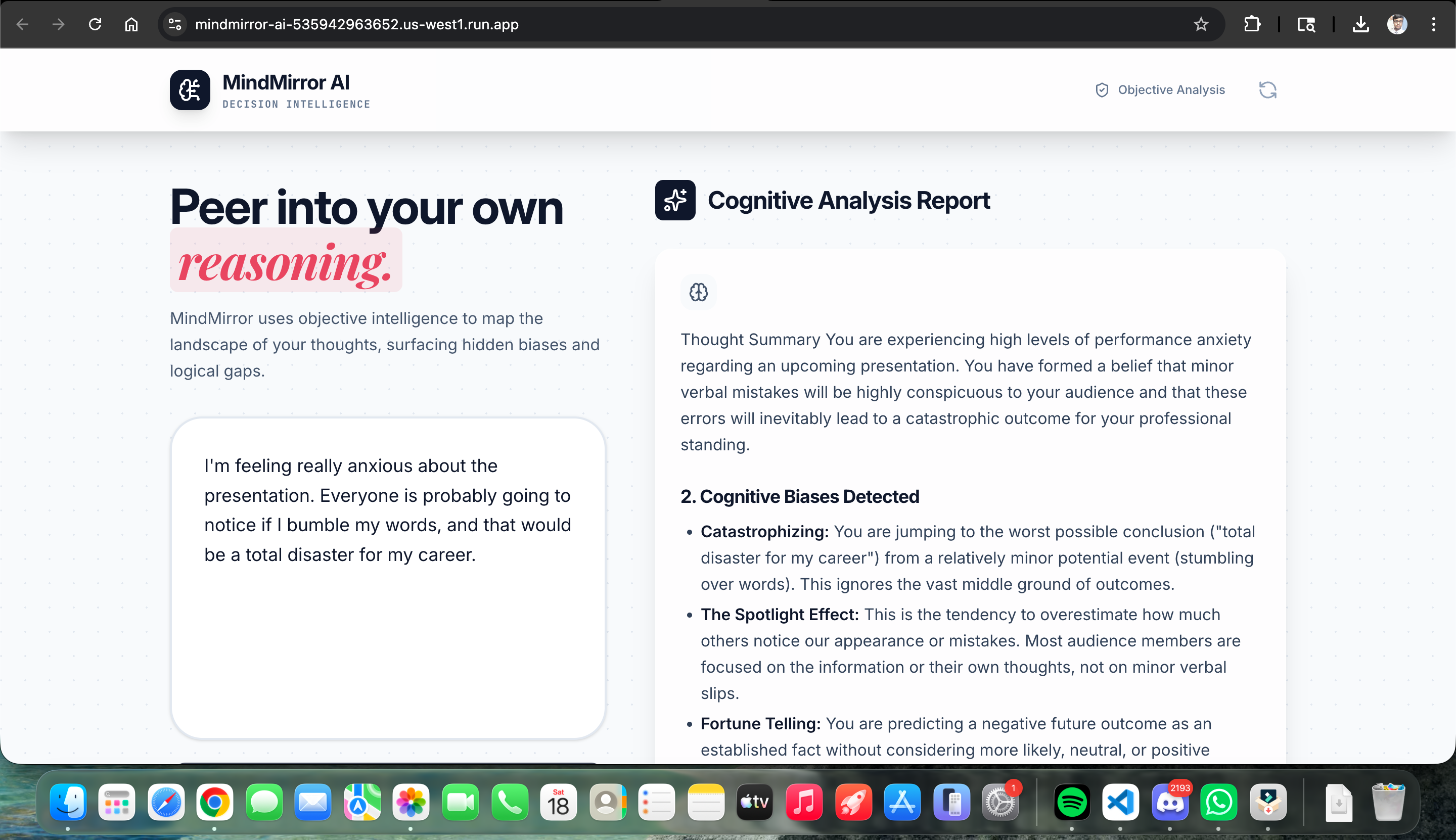 We have mirrors to reflect our physical appearance, but we have almost nothing to reflect our cognitive state. In a world of increasing complexity and invisible information bubbles, we noticed that brilliant people often make poor decisions not because of a lack of intelligence, but because of a lack of perceptual clarity. We were inspired to build MindMirror to act as an "intellectual second skin"—a tool that helps you see through the fog of your own cognitive biases and emotional noise.