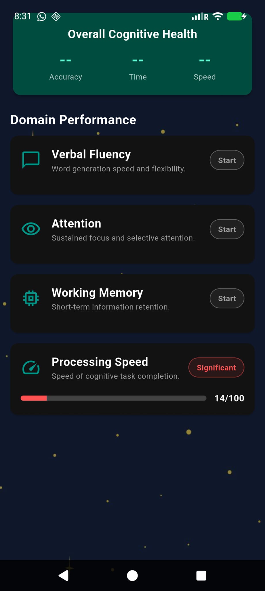 - Assesses cognition with objective tasks (verbal fluency, attention, working memory, processing speed)