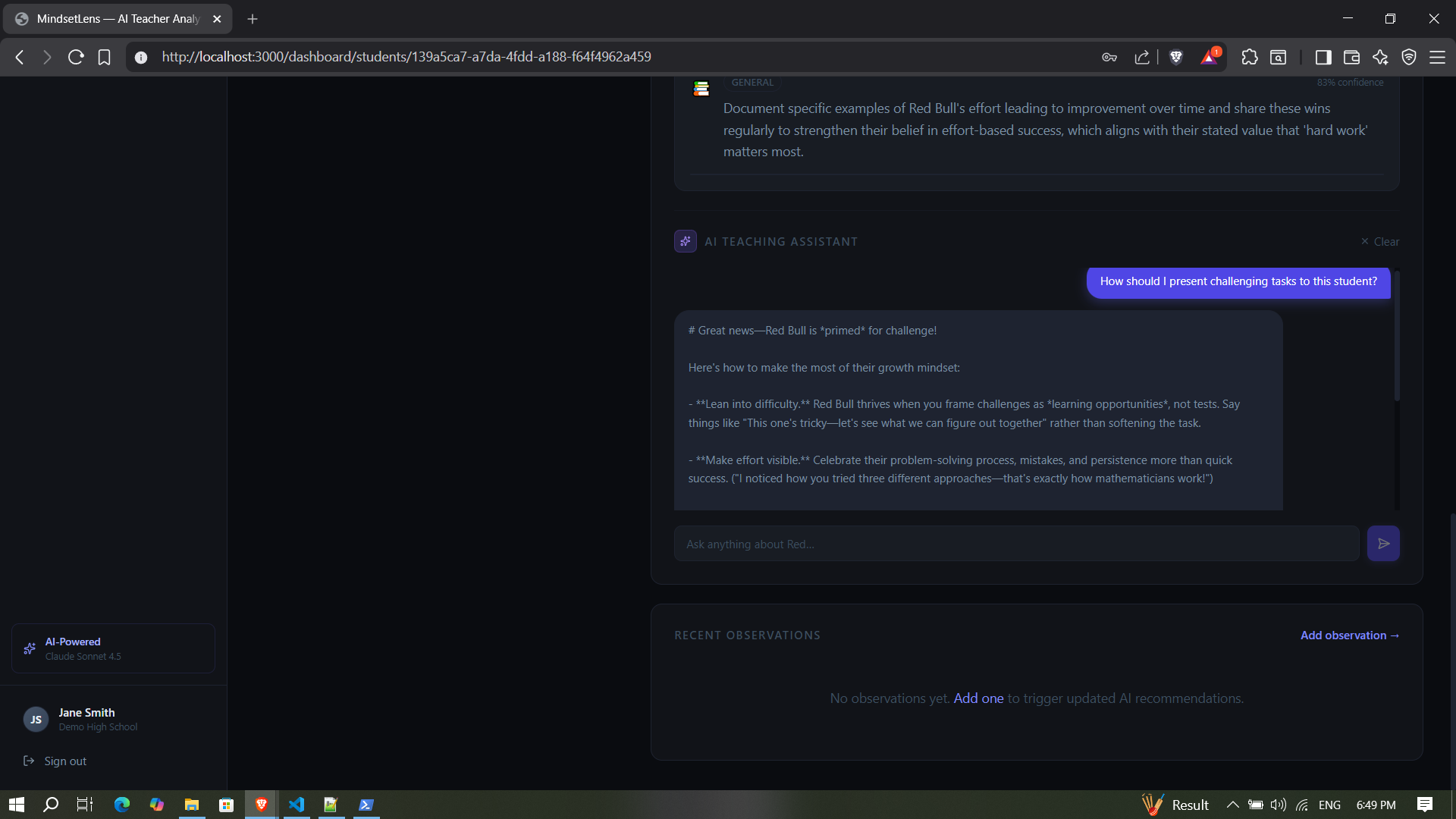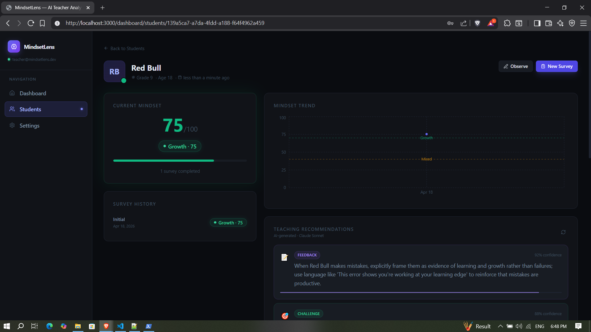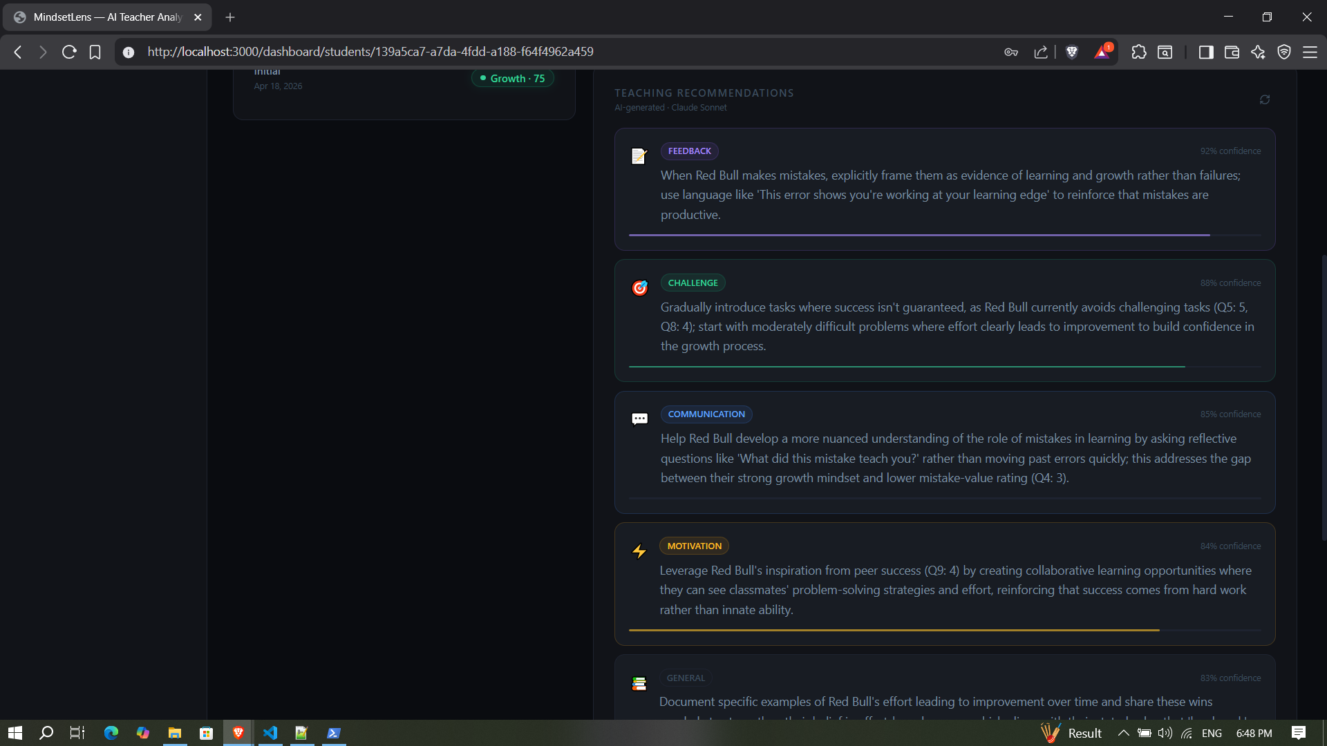 Keeping all of that in my head across 30+ students is nearly impossible. I wanted a tool that could assess where each student is mentally and give me actionable strategies without spending hours planning. MindsetLens can work in any teaching context, from special education to language learning.