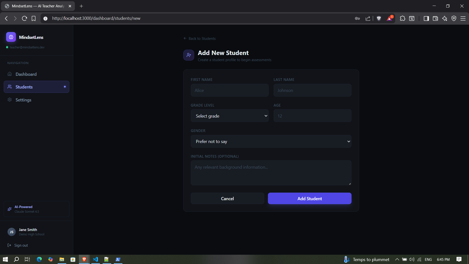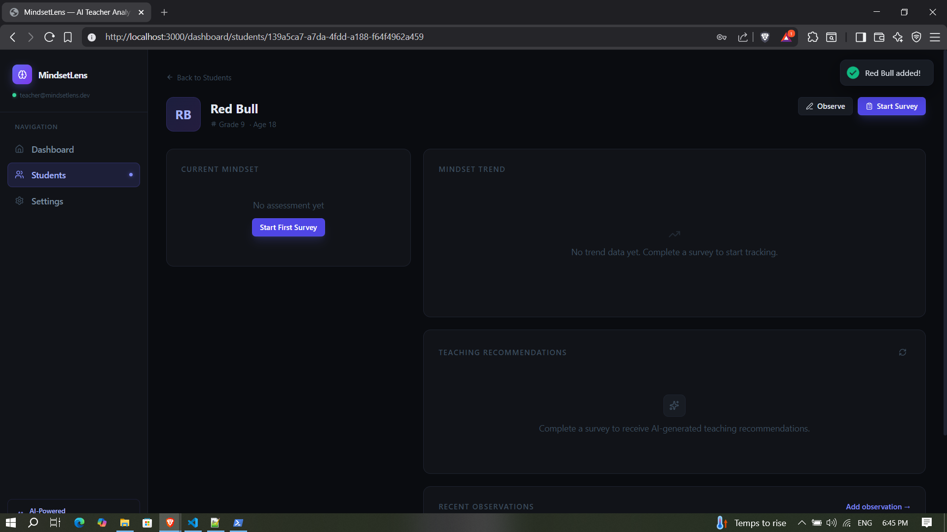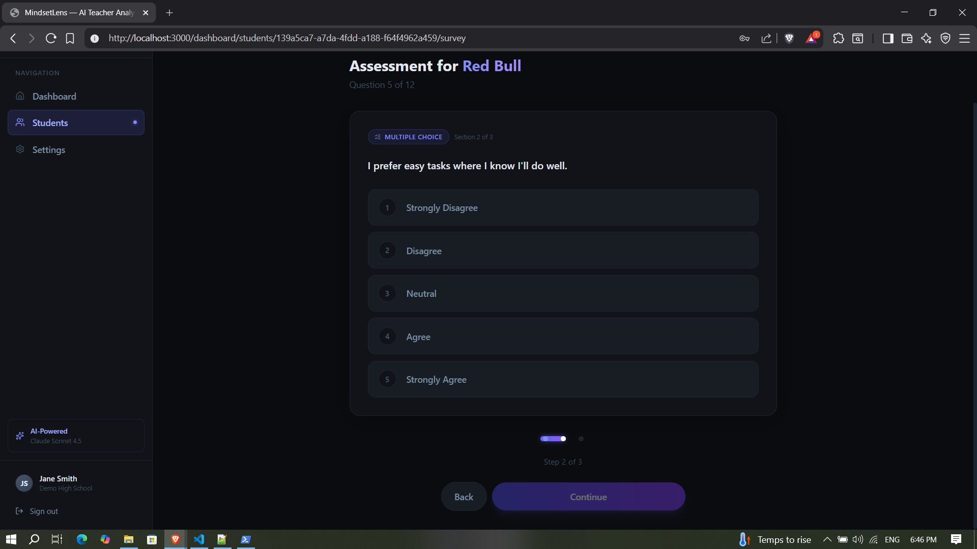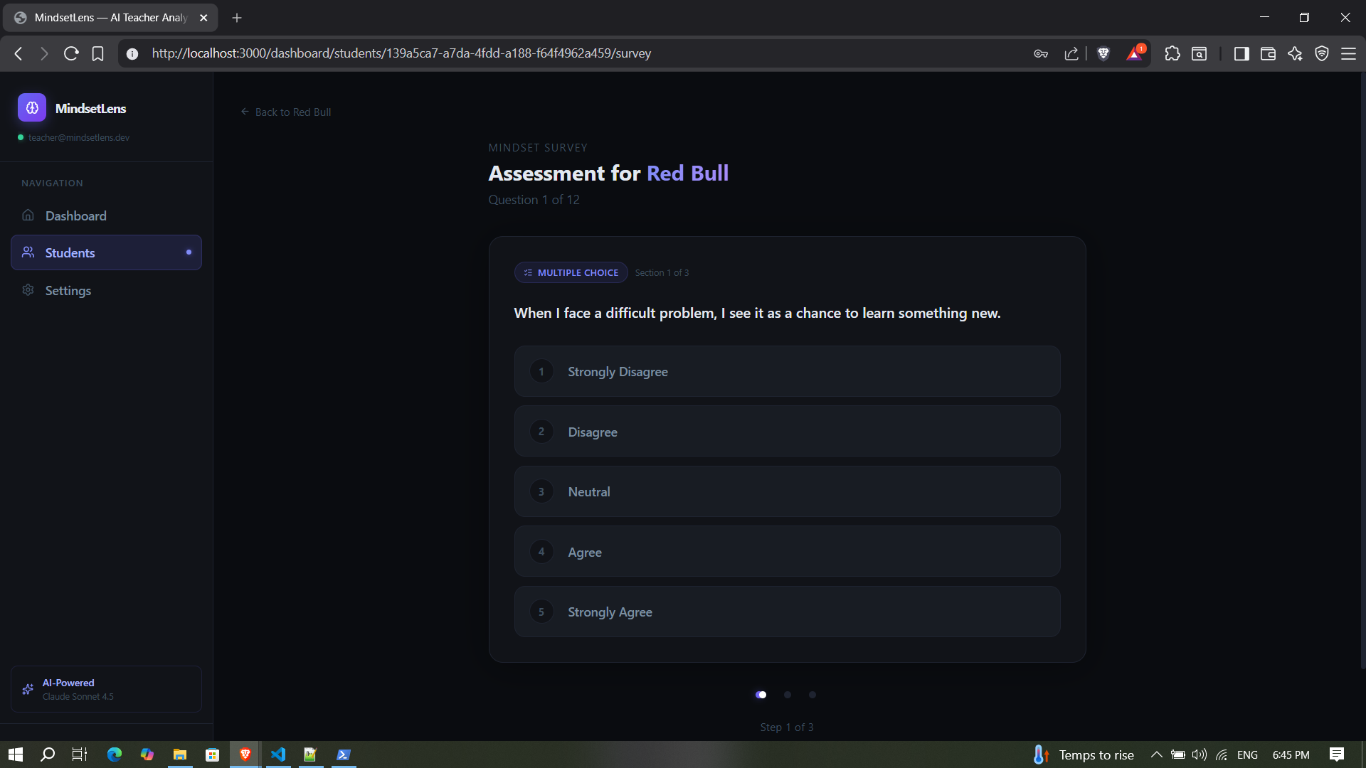 Keeping all of that in my head across 30+ students is nearly impossible. I wanted a tool that could assess where each student is mentally and give me actionable strategies without spending hours planning. MindsetLens can work in any teaching context, from special education to language learning.