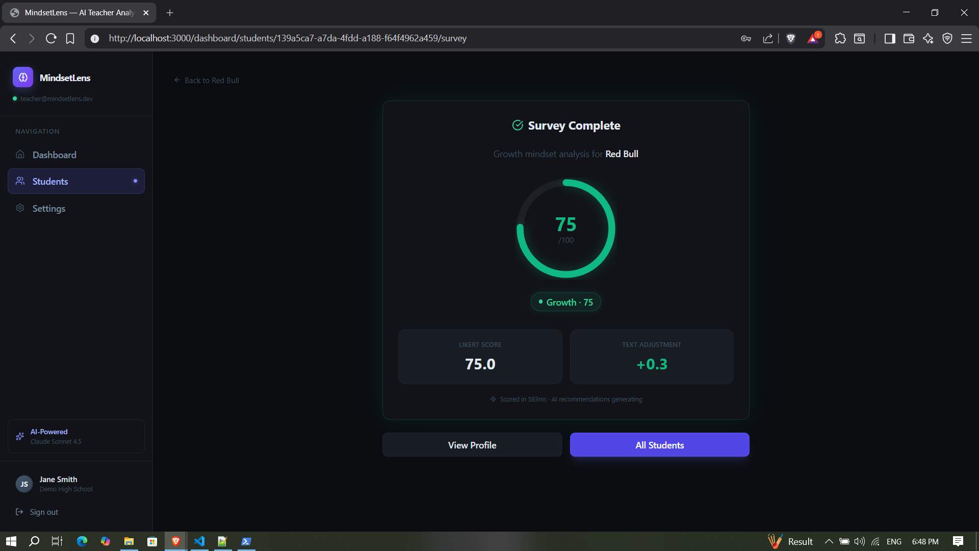 - Receive an AI-calculated Growth Mindset Score (0-100).