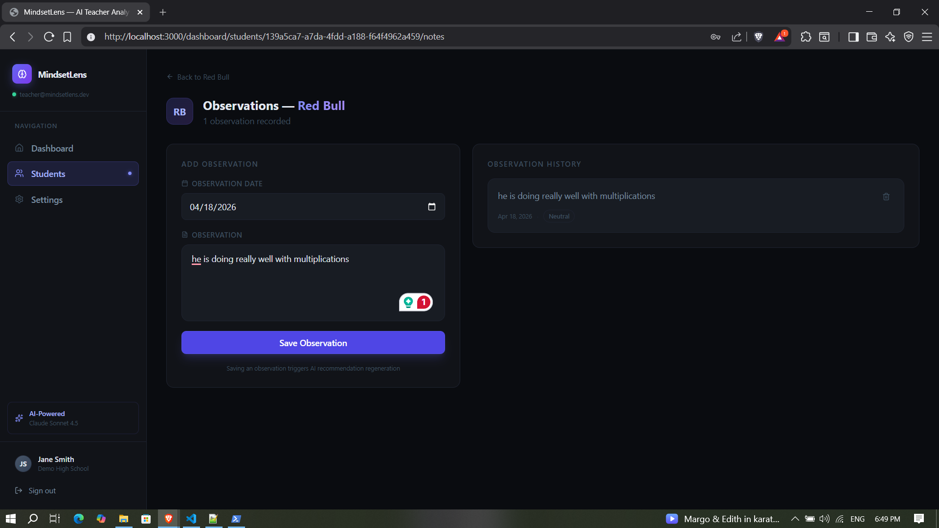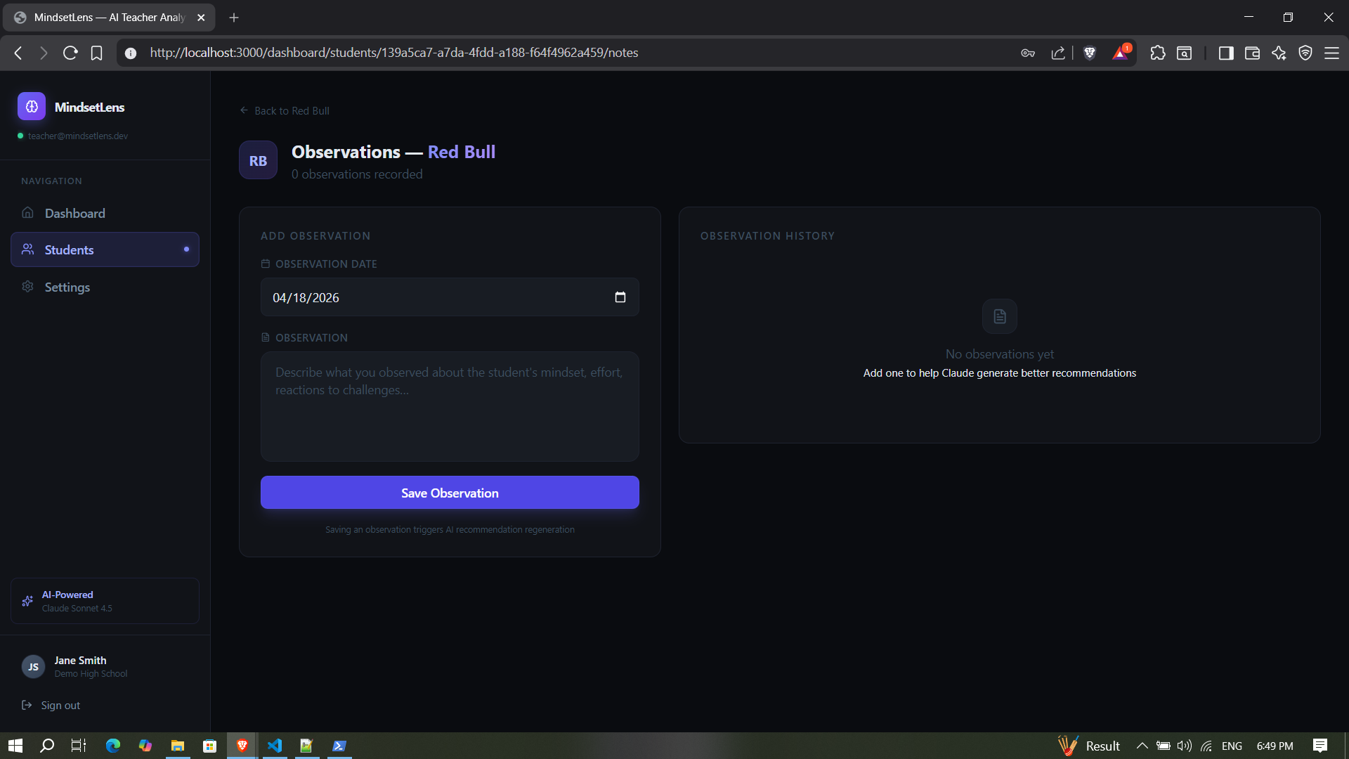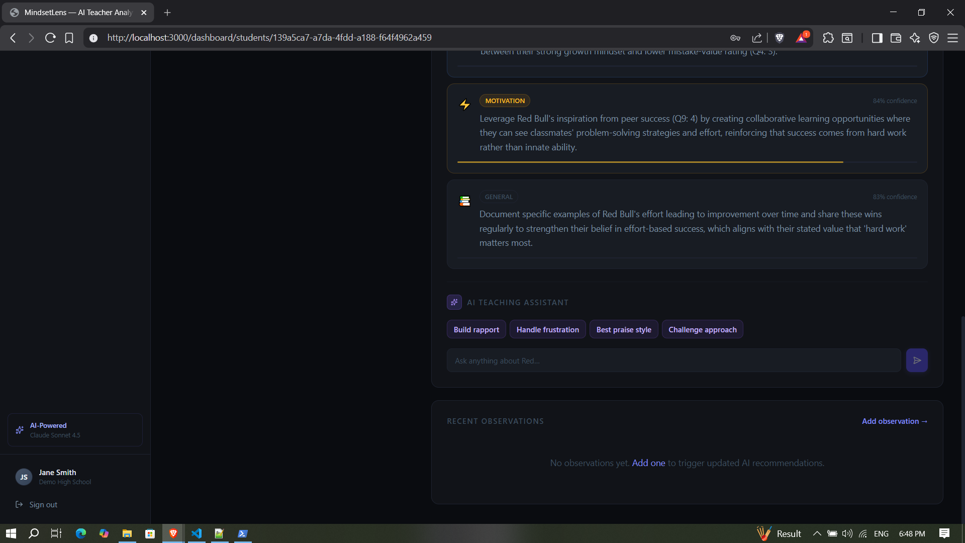 - Get 4-5 personalized teaching recommendations generated by Claude.