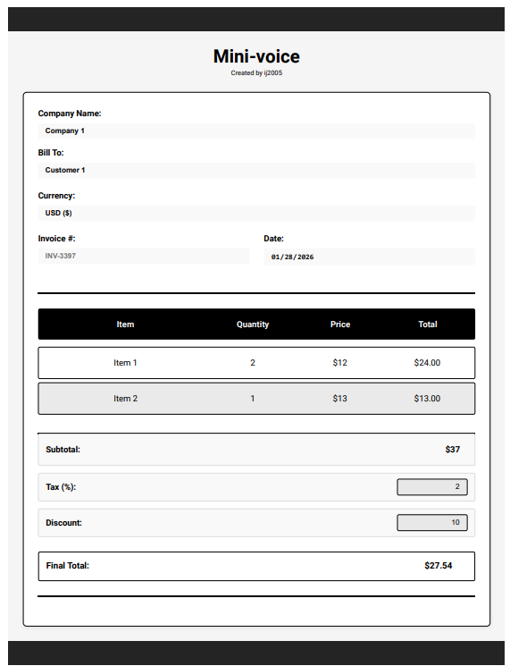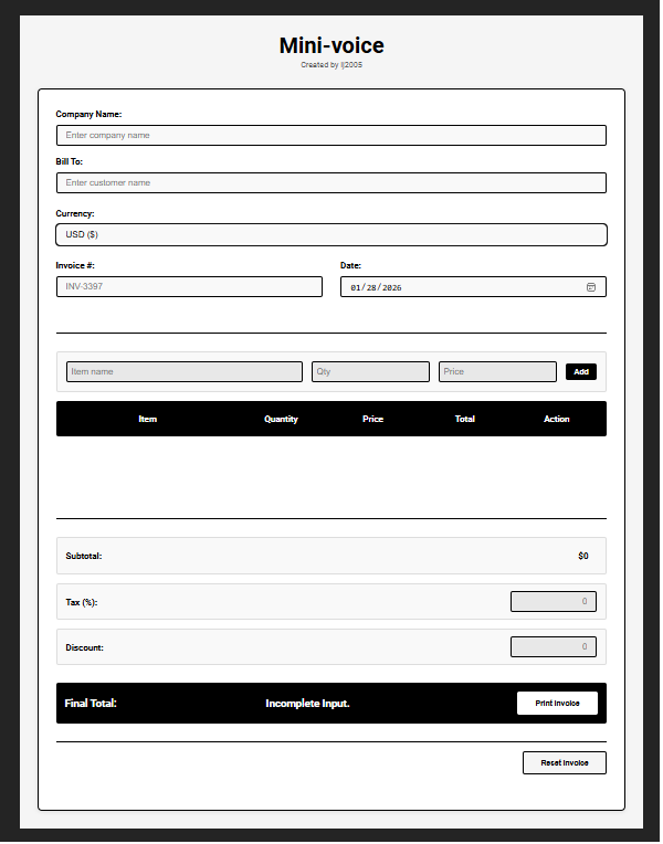 Created it with React + Vite. Decided to use this hackathon as a learning experience for me to know more about some scripting in JavaScript. First planned to integrate my basic knowledge in SQL with the use of node.js but decided to just use this hackathon as a way to refresh myself in doing basic frontend with simple codes. Front-end was assisted with AI (ChatGPT & Copilot), focused more on the handling and commands of how each input would work out.