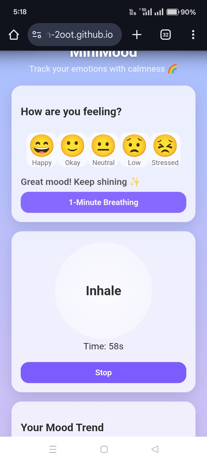 MiniMood helps students improve emotional awareness and manage stress through multiple integrated features. At the core, there is a mood picker with five emoji-based emotion levels, which provides instant mood-specific tips and affirmations. Each mood entry is saved locally to maintain a history of recent moods, which is visualized through a dynamic trend graph created with Chart.js. Users can also write a short journal note each day to reflect on their feelings, practice a 1-minute guided breathing exercise, and listen to optional relaxing background music. The app is designed with a clean glass-style UI that feels calm and relaxing. It works completely offline, loads instantly, and remembers all user entries using LocalStorage.