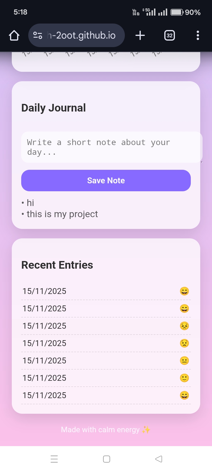 Developing and debugging the app entirely from a mobile device was a significant challenge. Making the UI clean, readable, and calming across different screen sizes required multiple iterations. Ensuring that Chart.js updates dynamically whenever a new mood is logged took careful attention, and creating a smooth inhale/exhale breathing animation synced with a timer was tricky. Structuring LocalStorage to save multiple mood entries correctly and deploying the project on GitHub Pages from a mobile browser were also challenging tasks. Each of these hurdles taught me valuable lessons in mobile-first design, JavaScript logic, and deployment.