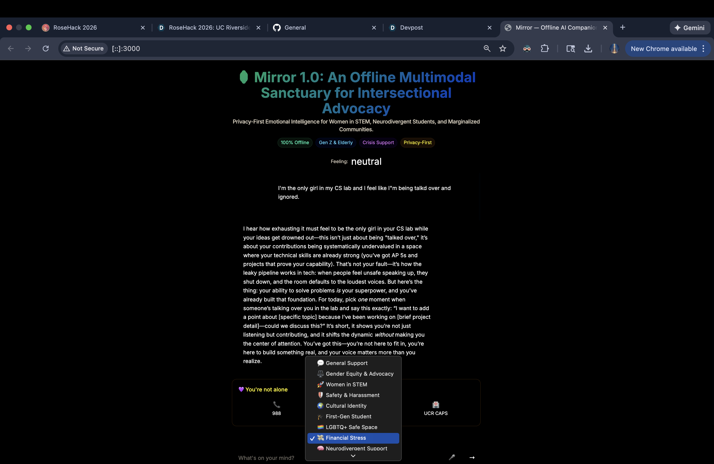 The inspiration for Mirror 1.0 came from seeing the "Empathy Gap" in modern AI. Most mental health tools are cloud-based data-mining traps that fail to understand the specific systemic pressures—like the "leaky pipeline" in tech or cultural imposter syndrome—faced by women and minorities. We wanted to build a sanctuary: a tool that understands your identity and never lets your data leave your device.