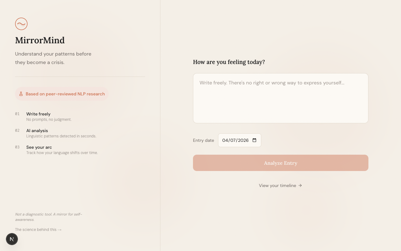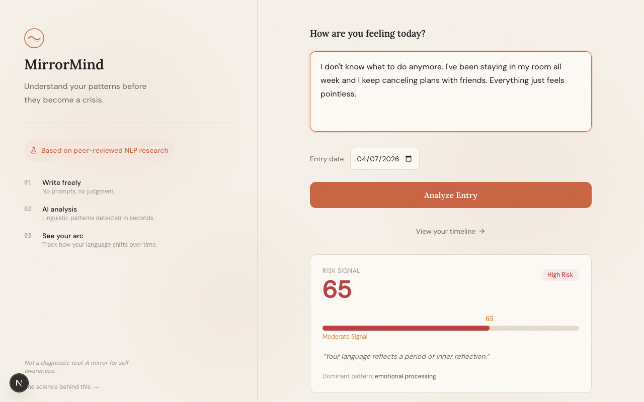 MirrorMind is a web-based linguistic analysis tool that helps college students recognize early patterns of emotional distress in their own writing — before those patterns become a crisis.