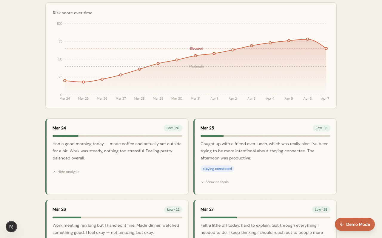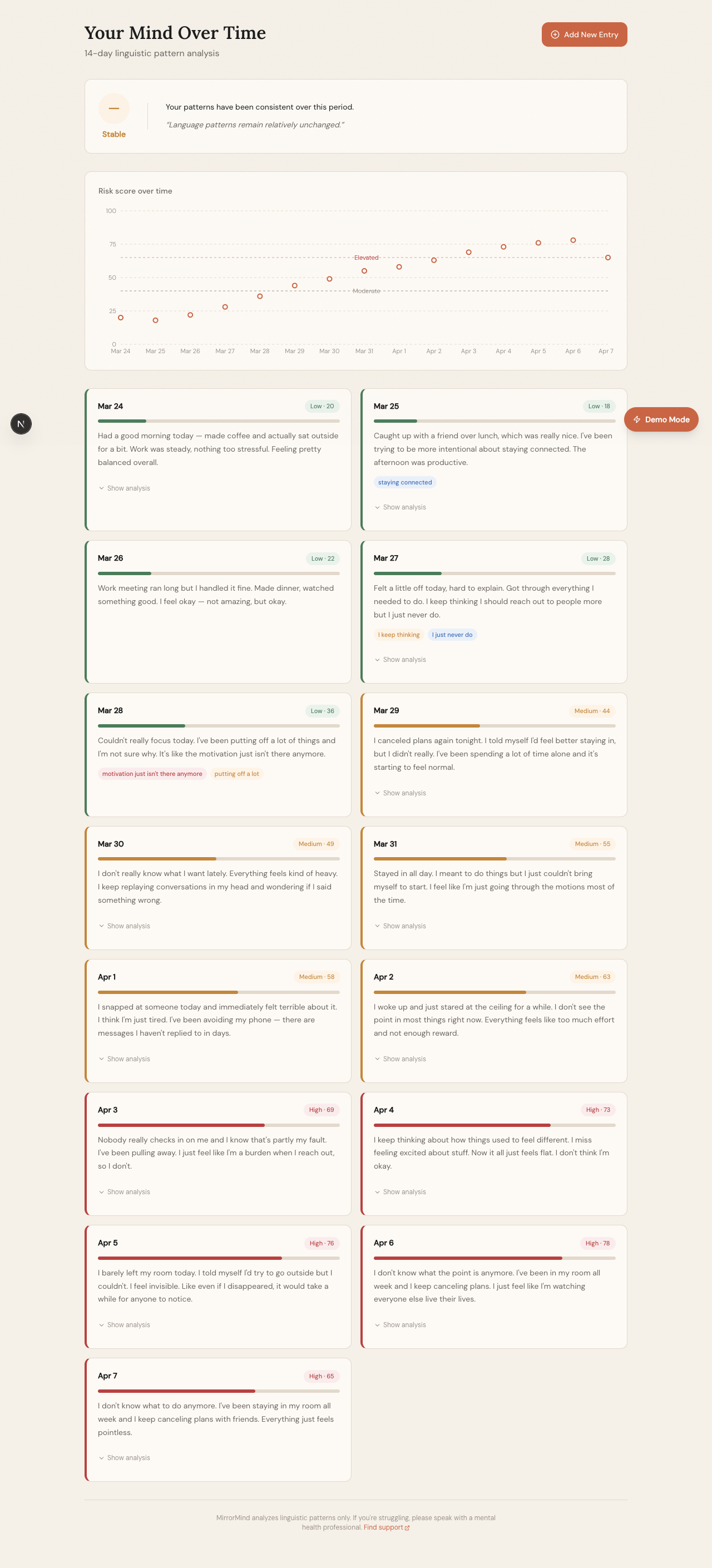 Over time, MirrorMind tracks entries and visualizes the trend: showing whether a user's language is improving, stable, or declining. This longitudinal view is the core innovation: a single score means little, but a two-week trajectory of rising linguistic risk is a meaningful signal that something may need attention.