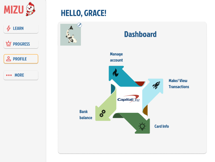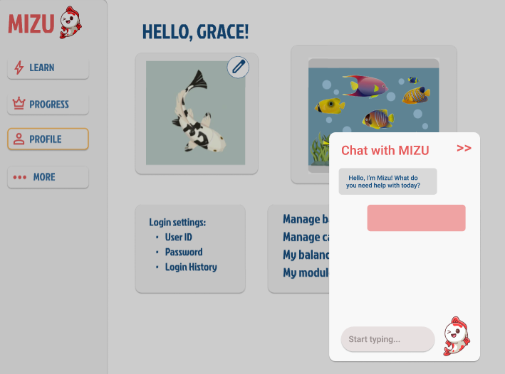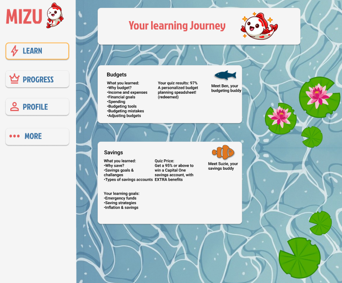 Mizu is our Mascot! He will guide you through the website and help you interact with the website to make the most out of it! Mizu is a little koi fish who knows a lot about managing money, and he hopes to revolutionize your world with better money management. Our interactive platform allows users to build financial literacy skills through quizzes and modules. Users can track their progress and build an aquarium of fish as they complete units.