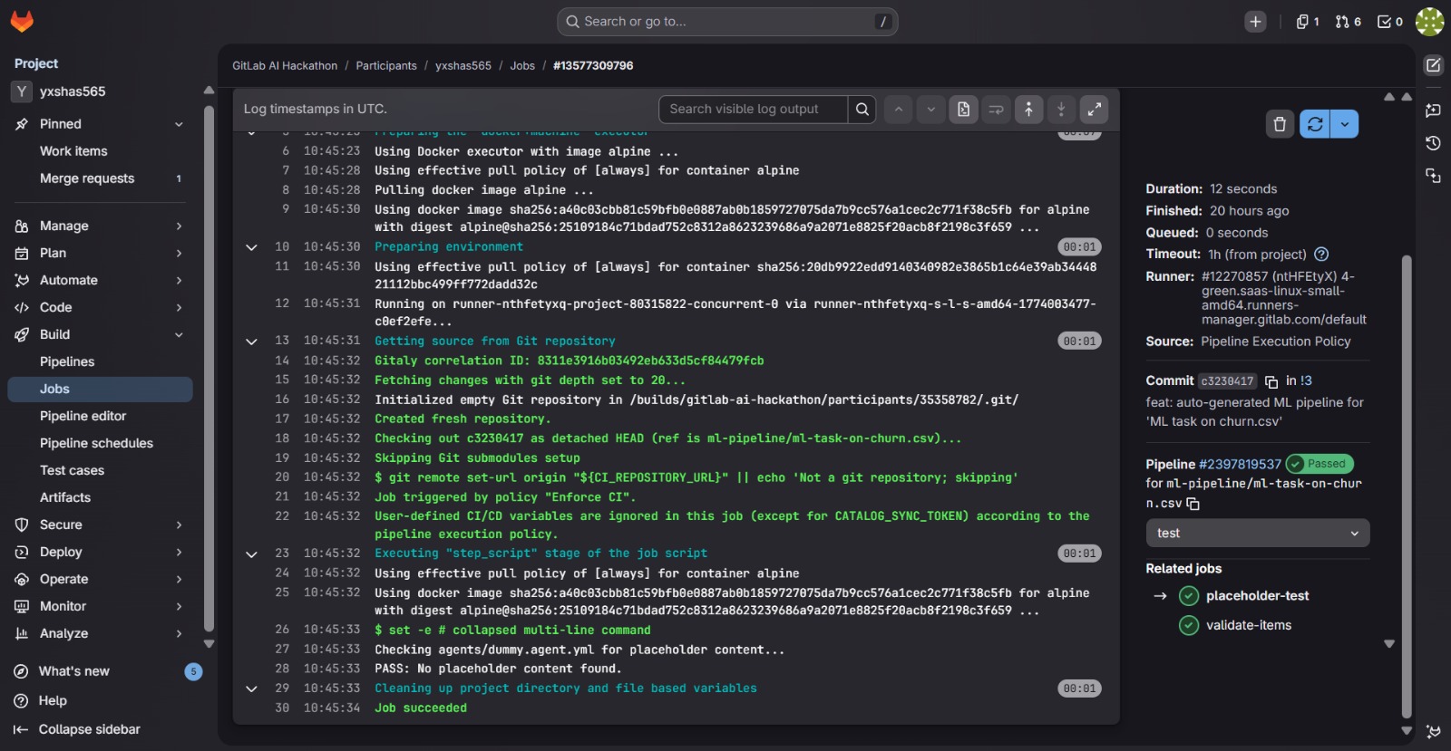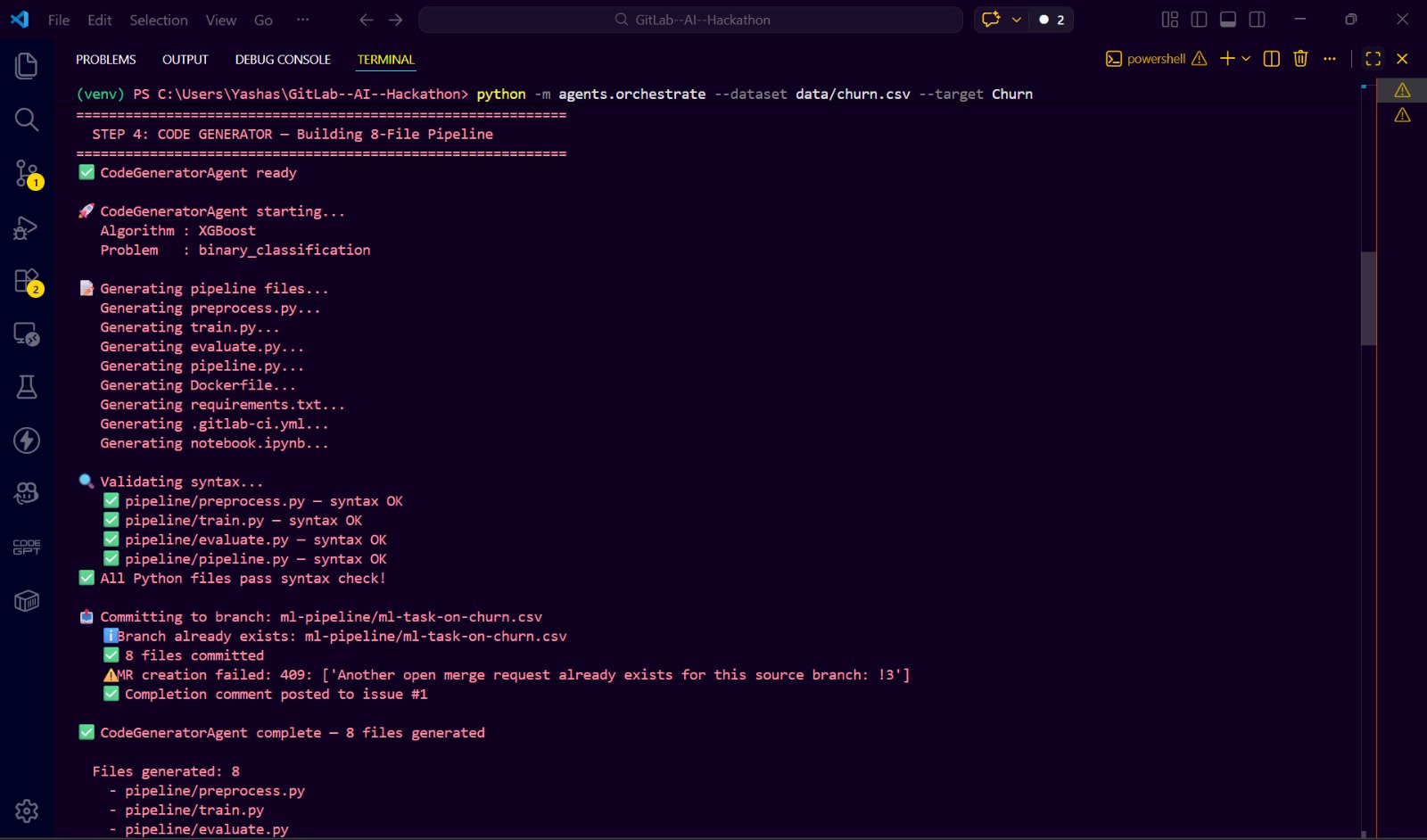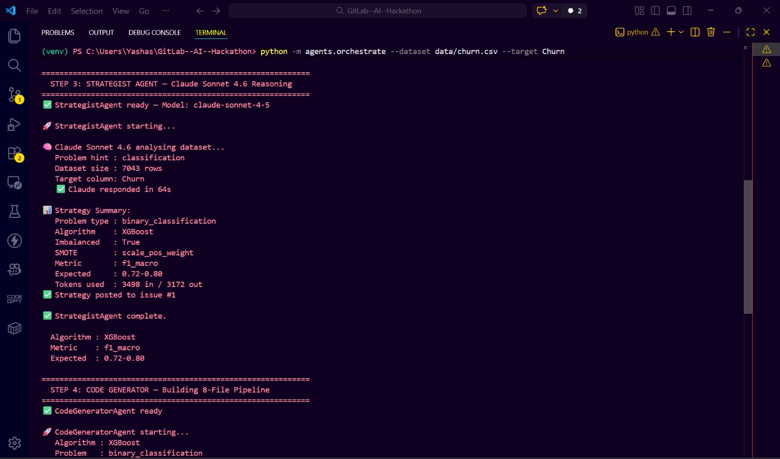 Transforms a GitLab issue into a production-ready ML pipeline in 2 minutes. File an issue with your dataset, and 5 autonomous agents orchestrate the entire pipeline creation — from data analysis to model training to results reporting.