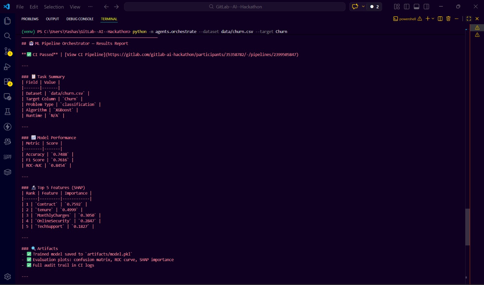 ✅ 5 autonomous agents working seamlessly together ✅ 131 unit tests, all passing ✅ Real ML models trained (F1=0.7616, ROC-AUC=0.8454) ✅ Production-grade code generation ✅ SHAP feature importance analysis ✅ Automatic CI/CD integration ✅ Completed in 3-4 days