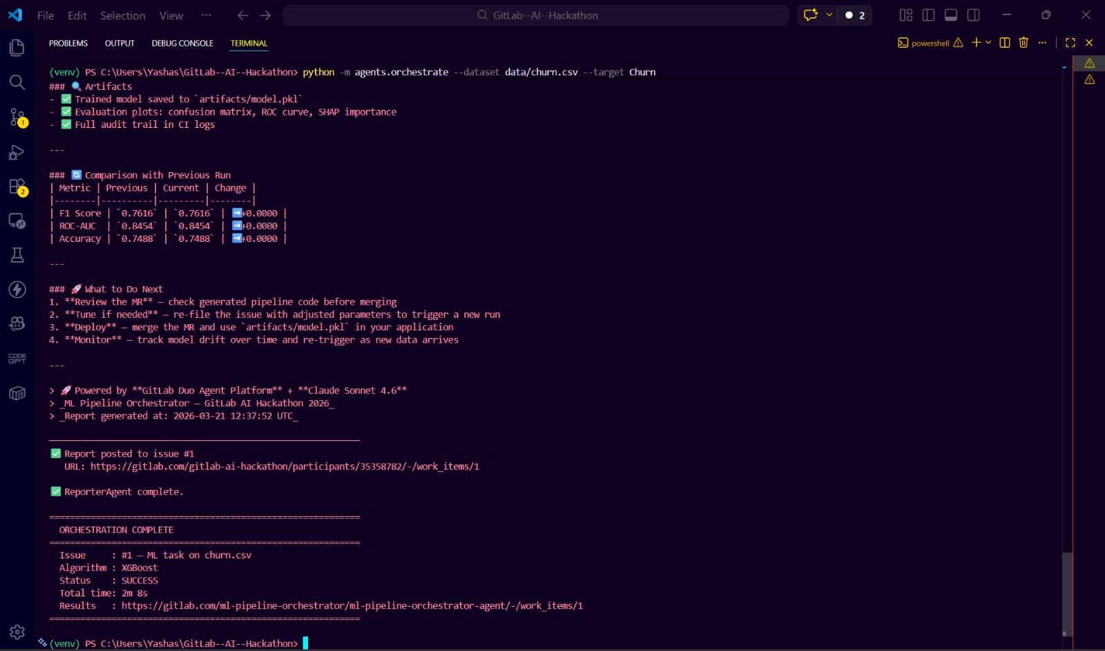 - Reporter Agent: Trains model, evaluates performance, posts results to GitLab