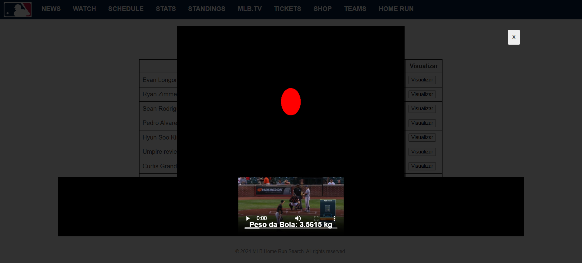 The data for each home run is displayed in a table with information such as player name, distance, speed, angle, ball weight, and spin.