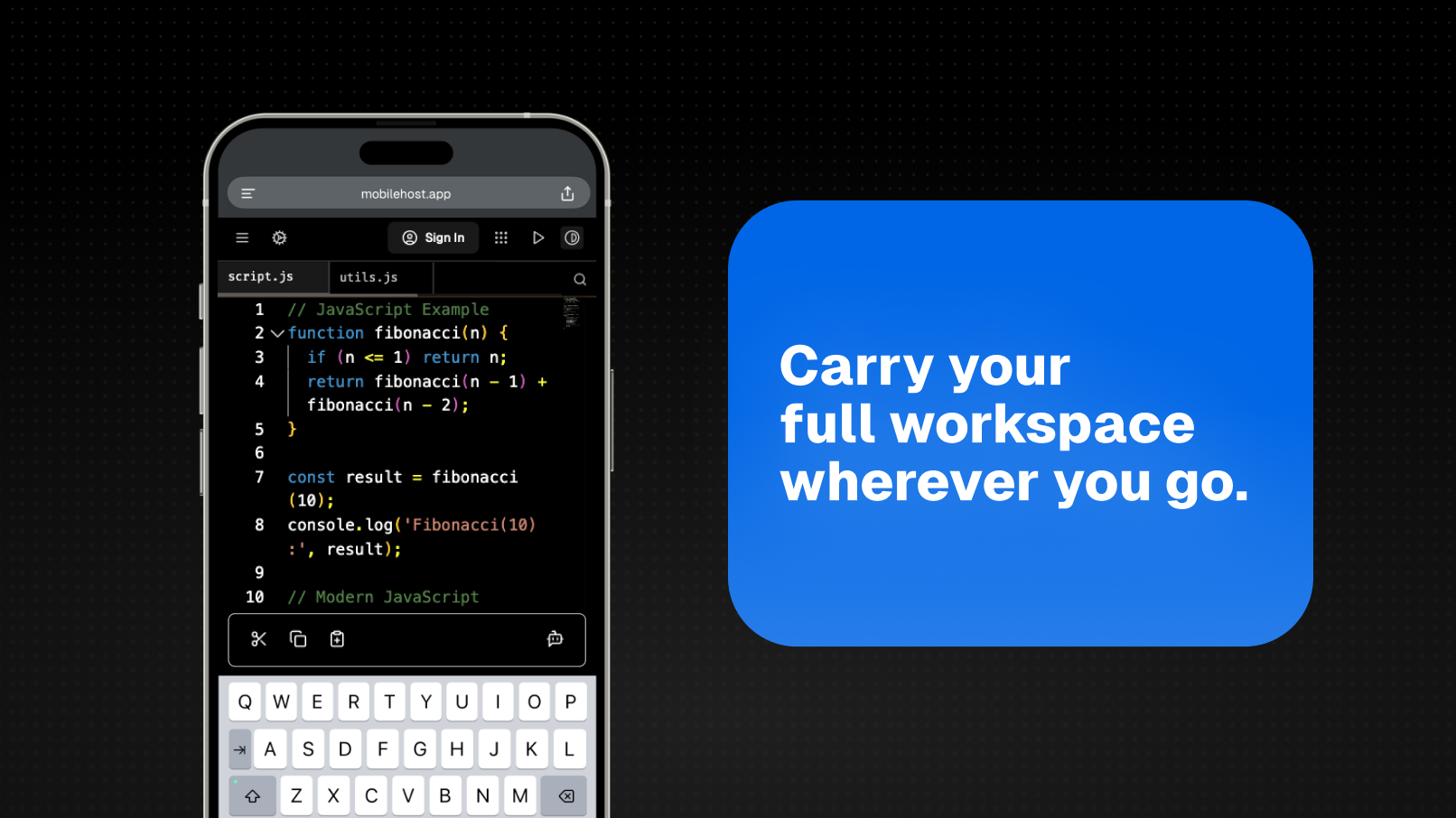 MobileHost is a fully-featured, browser-based IDE engineered for smartphones and tablets. From a single responsive workspace you can: