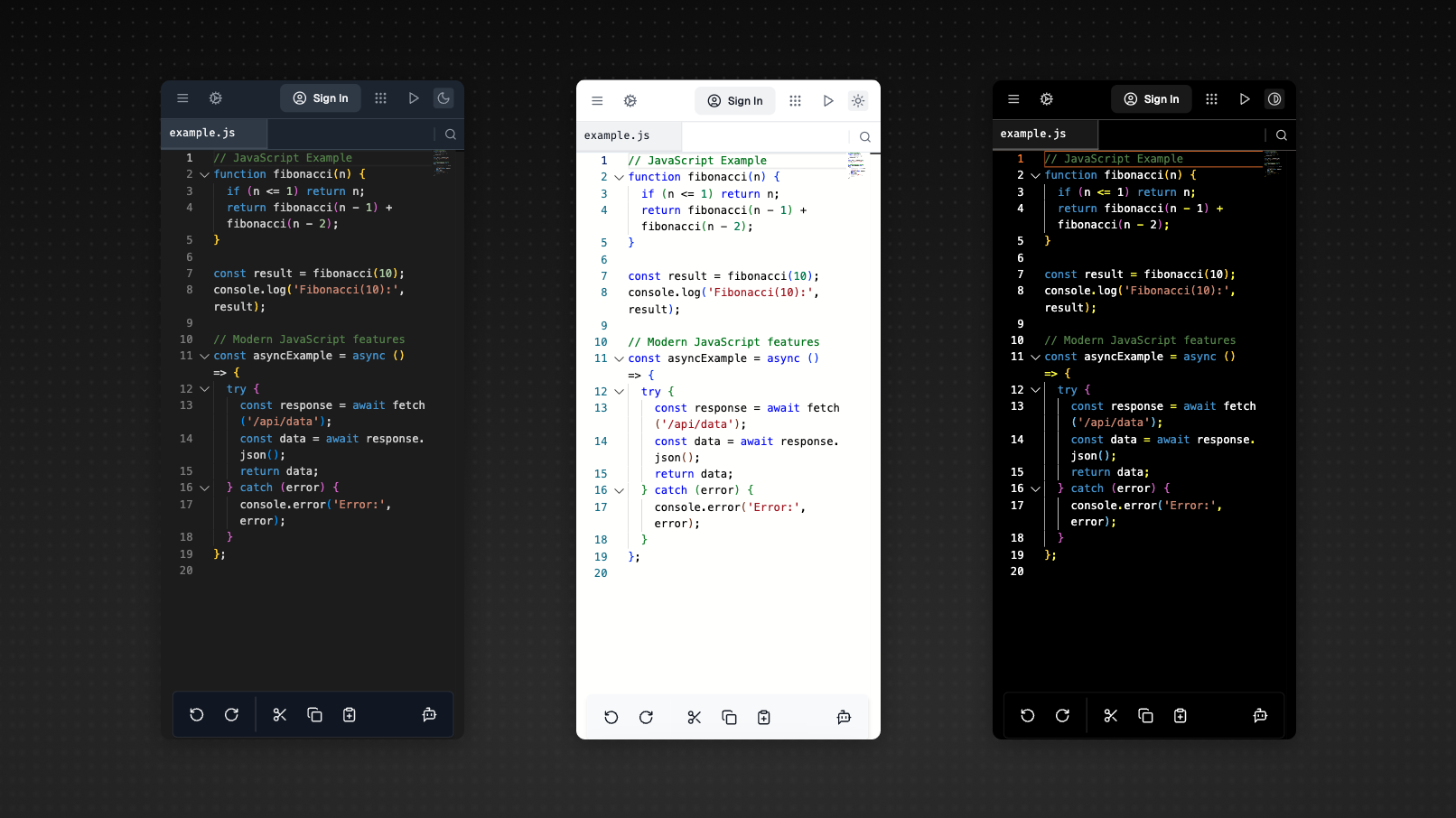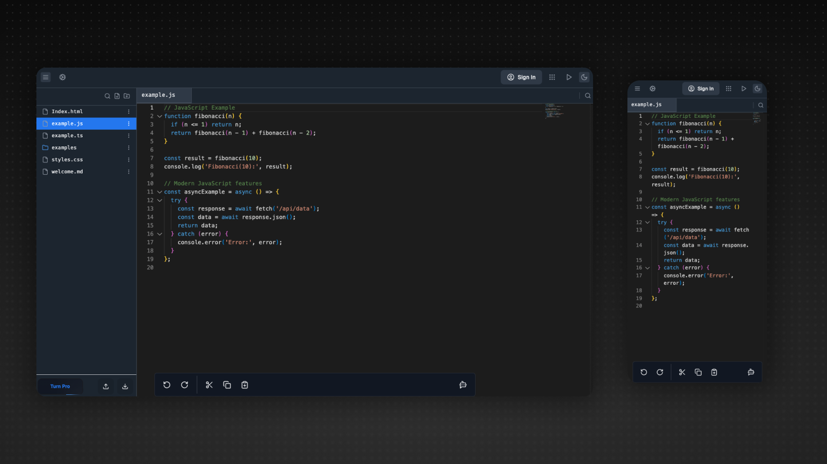 Mobile-First Editing Experience A compact, thumb-friendly toolbar surfaces the commands you need most—indent/outdent, multi-cursor select, integrated terminal toggle—reducing the tap-burden typical of shrunk-down desktop IDEs.