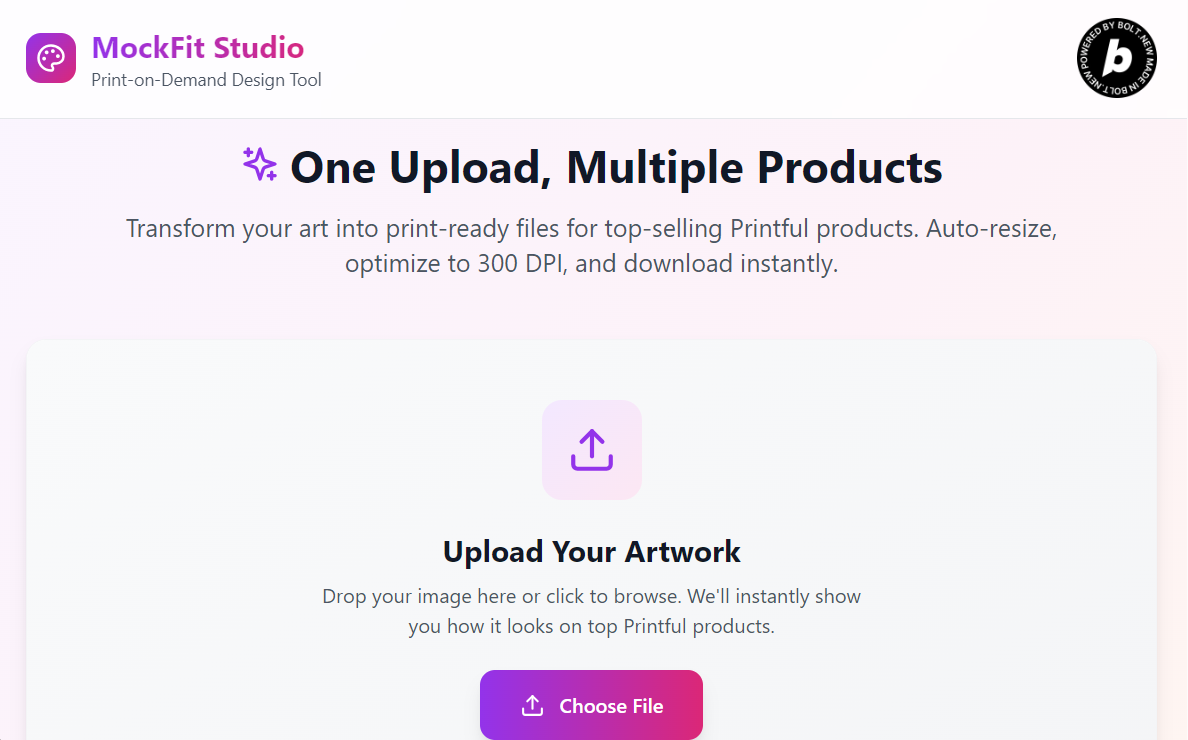 Built using the Bolt AI one-shot system, the app integrates the uploaded image, compares its dimensions with known Printful product specs (from a CSV file), and outputs styled previews, product suggestions, and optimized print files. The image can be manipulated live on a single UI screen — no tabs, no back-and-forth. It uses heuristics to recommend DPI scaling, show match % scores, and offer before/after downloads.