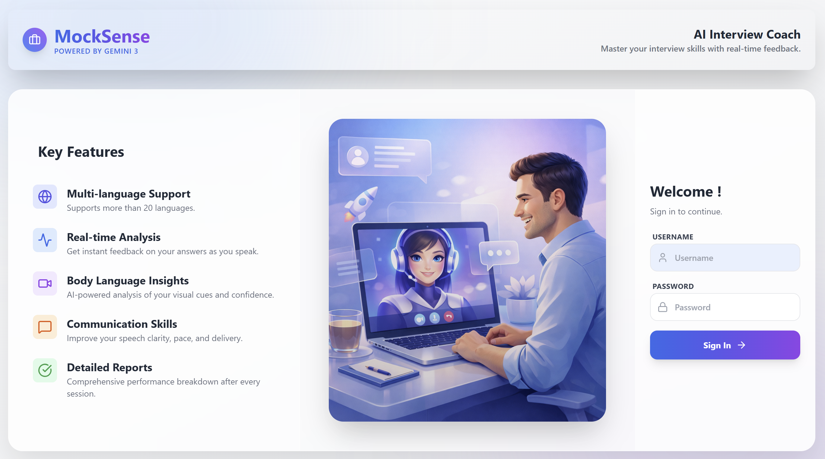 - 🗣️ Real-Time Multimodal Interaction: Candidates speak naturally to the AI. Using the microphone, MockSense listens to your answers, and using the camera, it analyzes your body language (eye contact, posture, nervousness) in real-time.