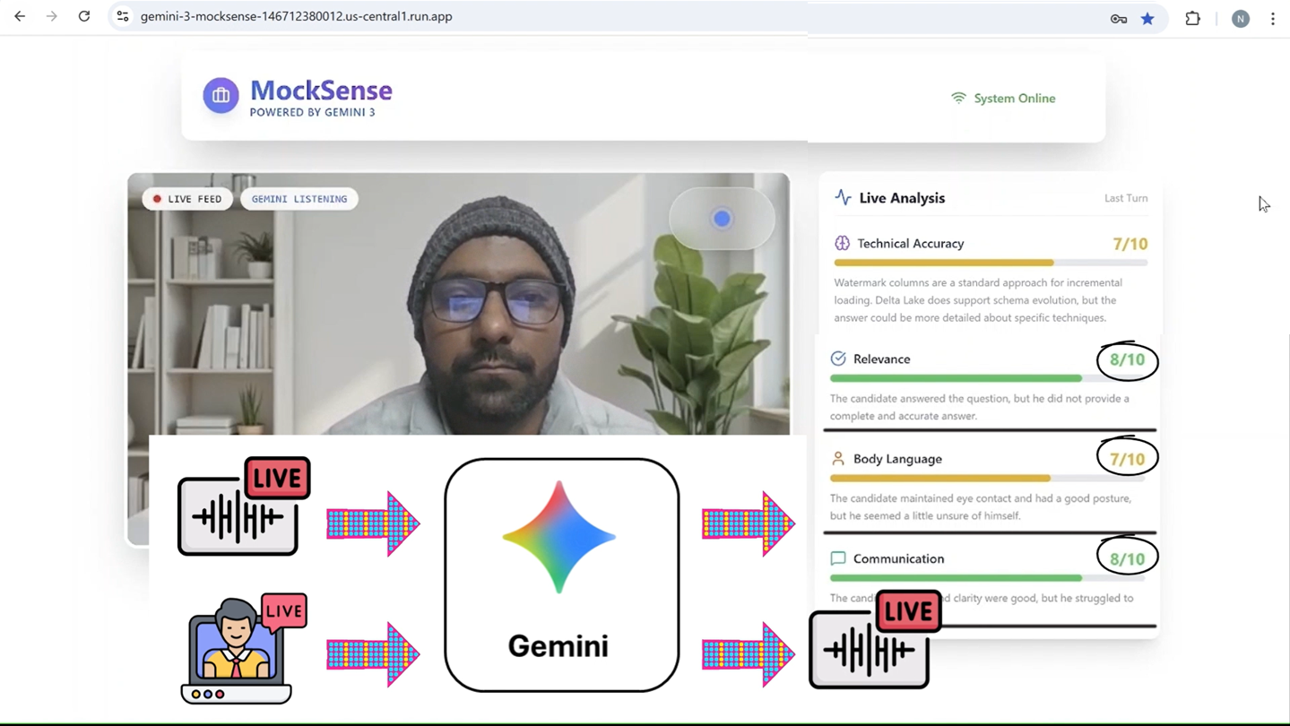 With the launch of Gemini 3 and specially Gemini live APIs, I realized we could build something that can take a mock interview like a real expert. I didn't just want a chatbot; I wanted a valuable coach that can see me and talk to me in real time like having a live interview. That's how the idea of MockSense was born from the desire to democratize elite-level interview coaching using the power of multimodal AI.