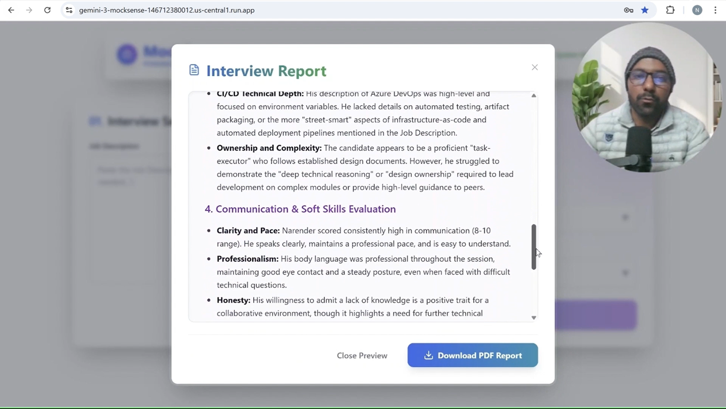 - 📑 Comprehensive Report: After the session, it generates a detailed report with executive summaries, strengths, weaknesses, and hiring recommendations. This report is available as a downloadable PDF for future reference.