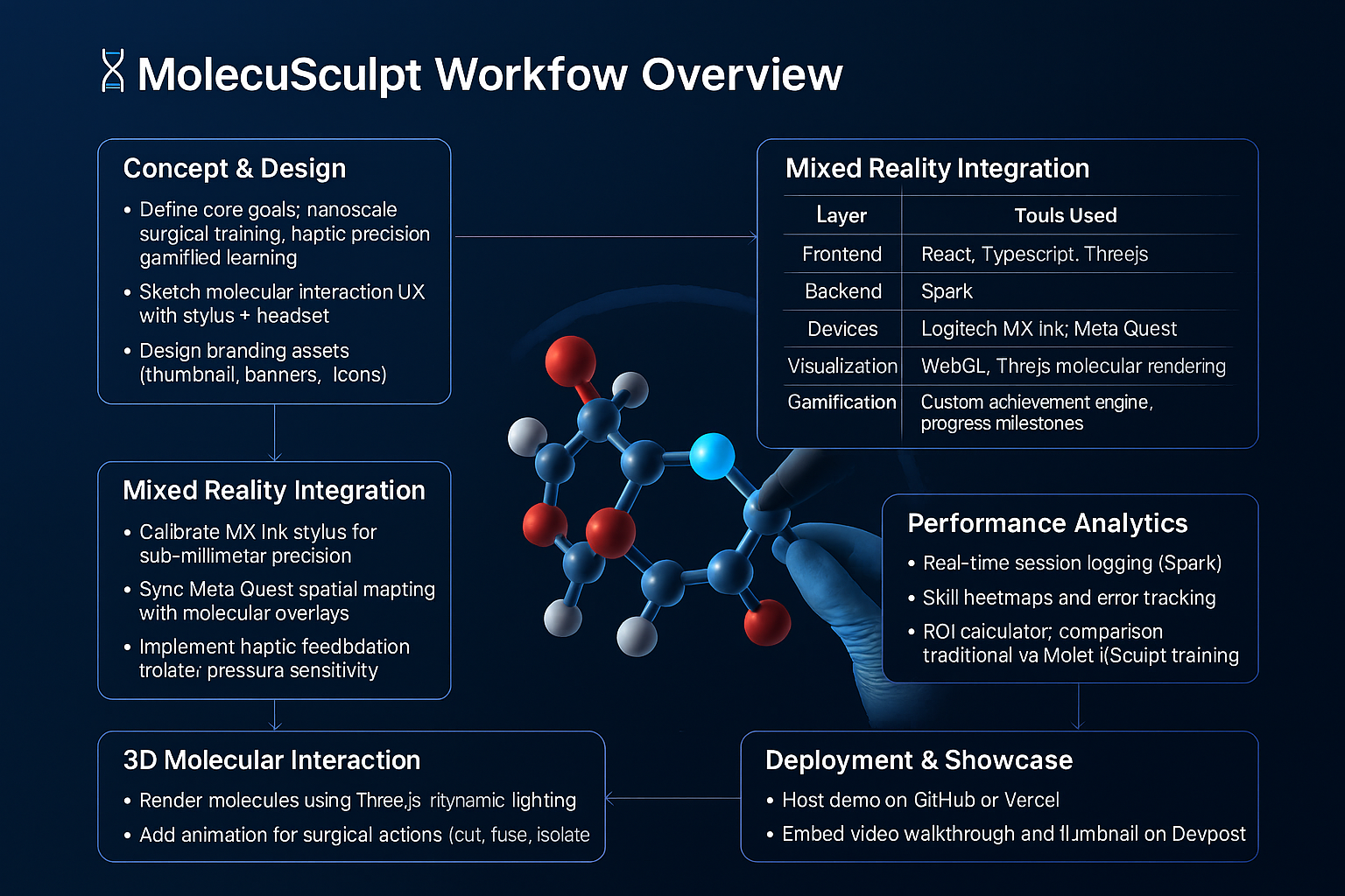 The inspiration for MolecuSculpt came from the realization that while medical science is rapidly advancing toward molecular and gene therapies, the tools for training surgeons to operate at this microscopic scale have lagged behind. We were fascinated by the potential of the MX Ink stylusโa mixed-reality peripheral offering unprecedented precision. We wanted to bridge the gap between abstract molecular biology and tactile surgical skill. The goal was to create a "flight simulator" for molecular surgery, where the margin for error is measured in nanometers, not millimeters ๐.