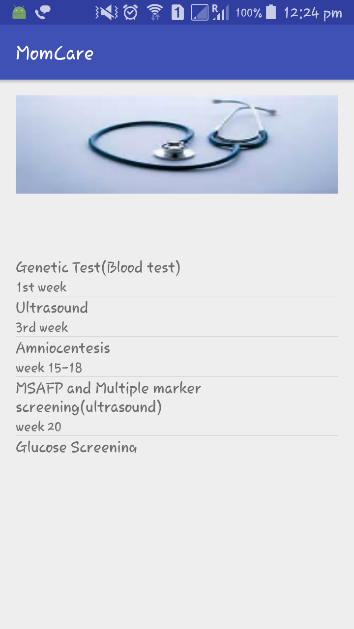 It reminds the user about the tests to be done in different months during pregnanacy, by setting up a reminder system and notifying through an alarm. It also looks for the nearest test centre.