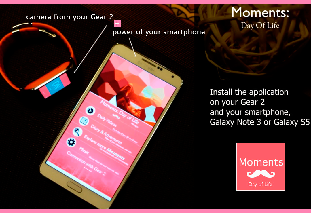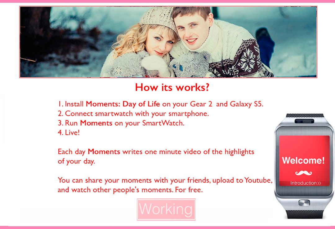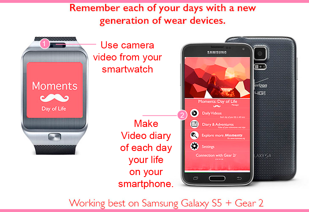 Mission? Moments created for smartwatch and inconvenient for use on the smartphone or tablet. Gear 2 is always with you and they will help you to keep the moments of your life in the form of daily video.