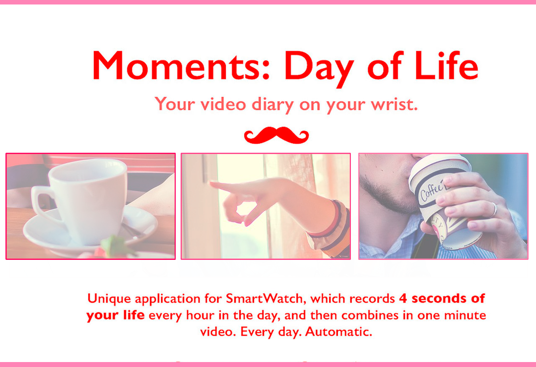 What? Moments records 4 seconds video every hour during a day of your life using a camera in your smartwatch and at the end of a day it produces a one minute video about your life today. Automatically. without your help or actions.