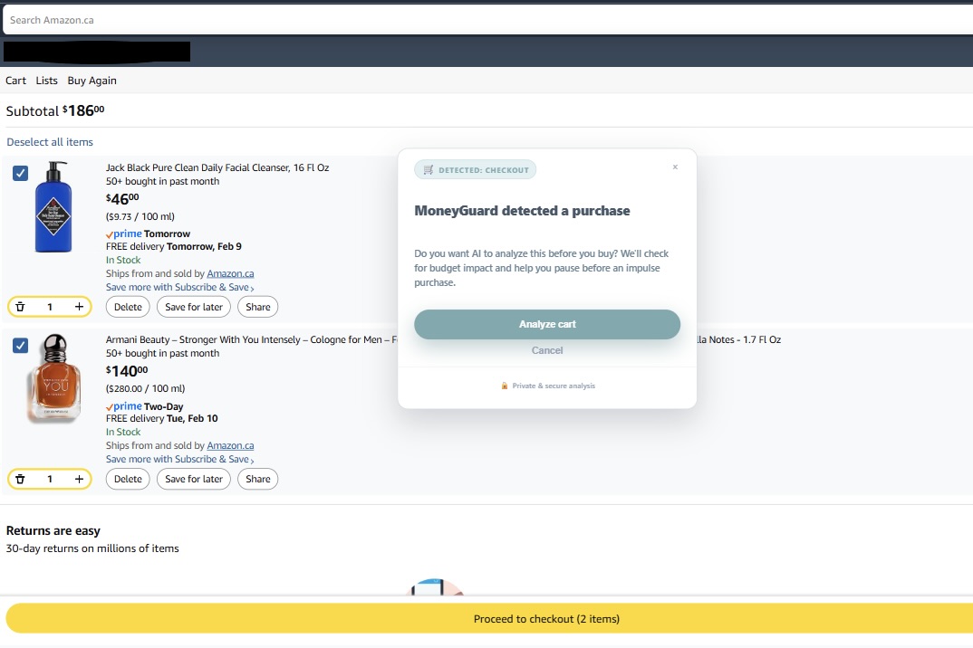 In the browser: A Chrome extension detects when you’re on a checkout-like page (cart, payment, buy, etc.) and surfaces a lightweight overlay: “MoneyGuard detected a purchase. Want AI to analyze it before you buy?” If you say yes, you get a deliberate cool-off moment while the system analyzes your cart—then you see budget impact (e.g. % of monthly budget), a short AI take on regret risk and value, and two clear choices: Ignore budget (log the purchase and move on) or Save money (record the amount as saved and go back). No blocking, no shame—just a moment of clarity.