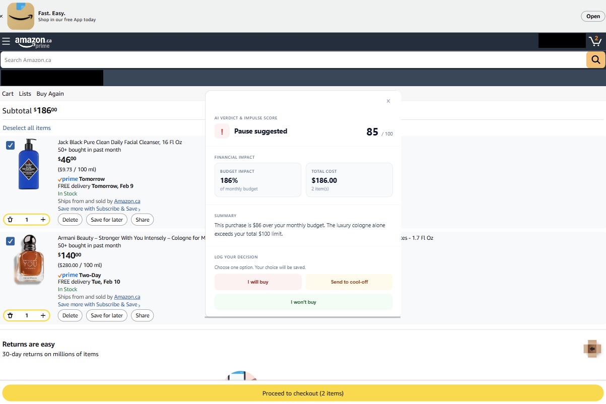 shared/code mean we ship features once and they work in both places. - Behavioral design, not just features: The flow is built around a real “cool-off” moment, optional analysis, and two explicit choices (log purchase vs. save). We’re proud that the UX reflects the research: nudge, don’t block; inform, don’t shame.