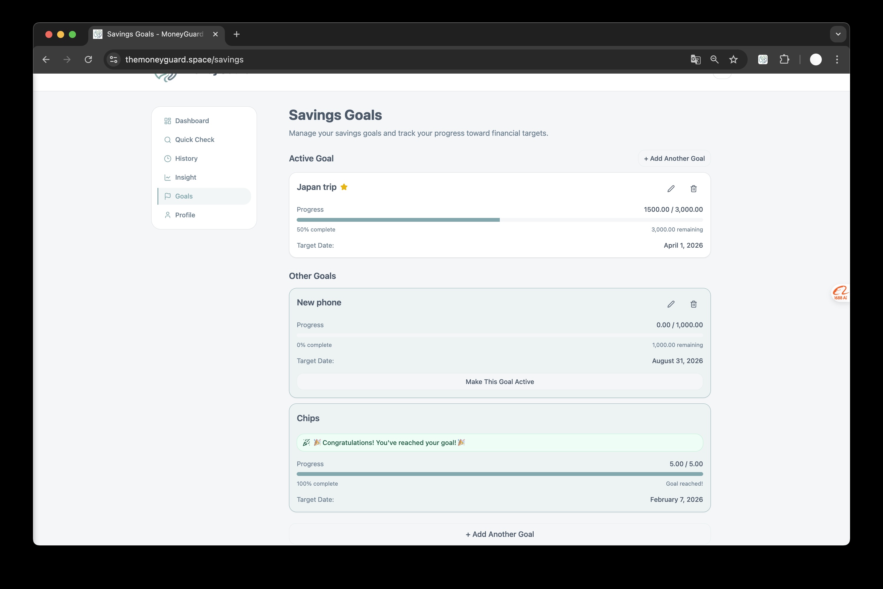 On the web: A Next.js app gives you one place for your financial behavior: dashboard, spending insight, savings goals, and manual or extension-synced analyses. One account, shared auth between web and extension, so your decisions and goals stay in sync everywhere.