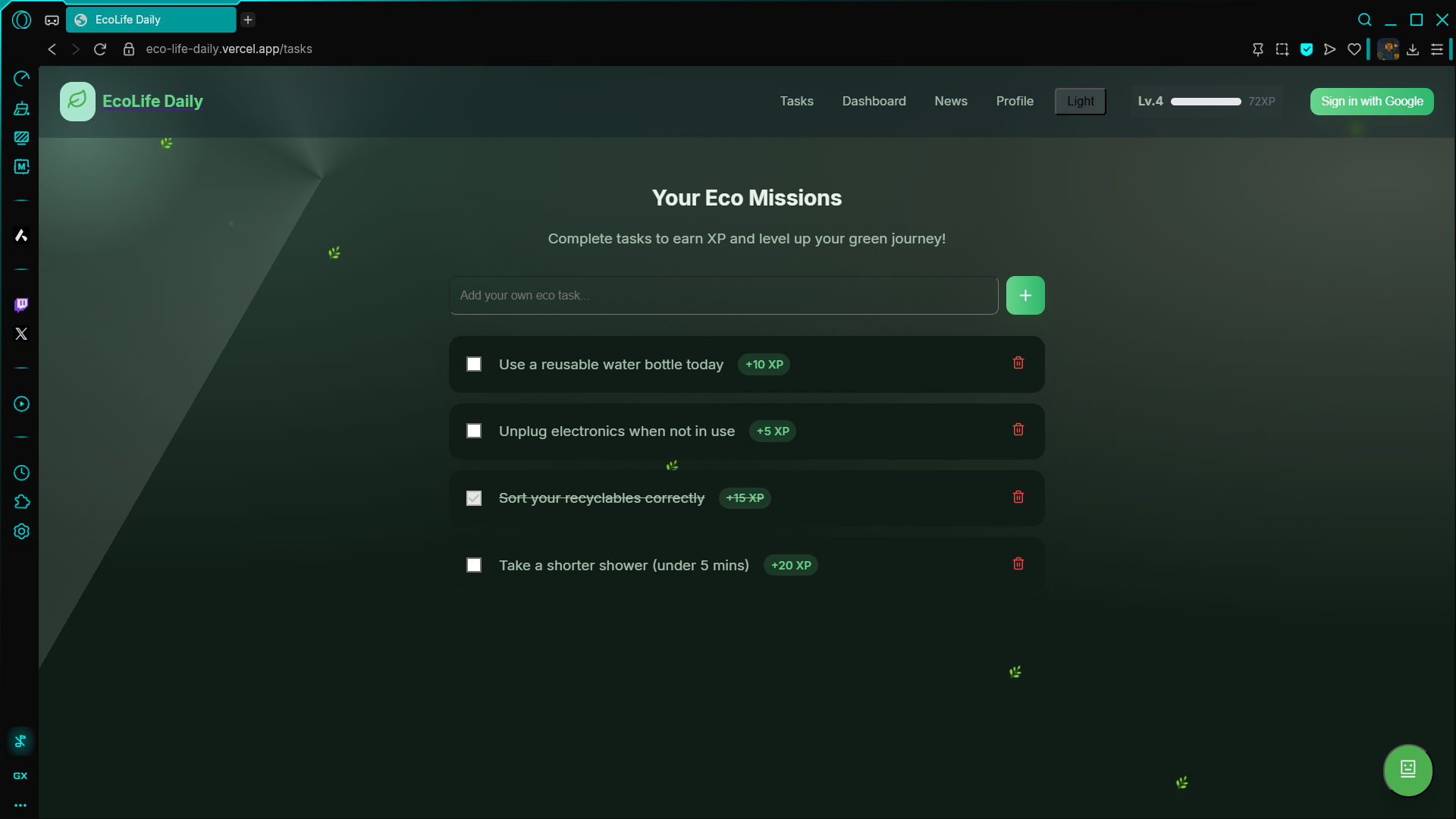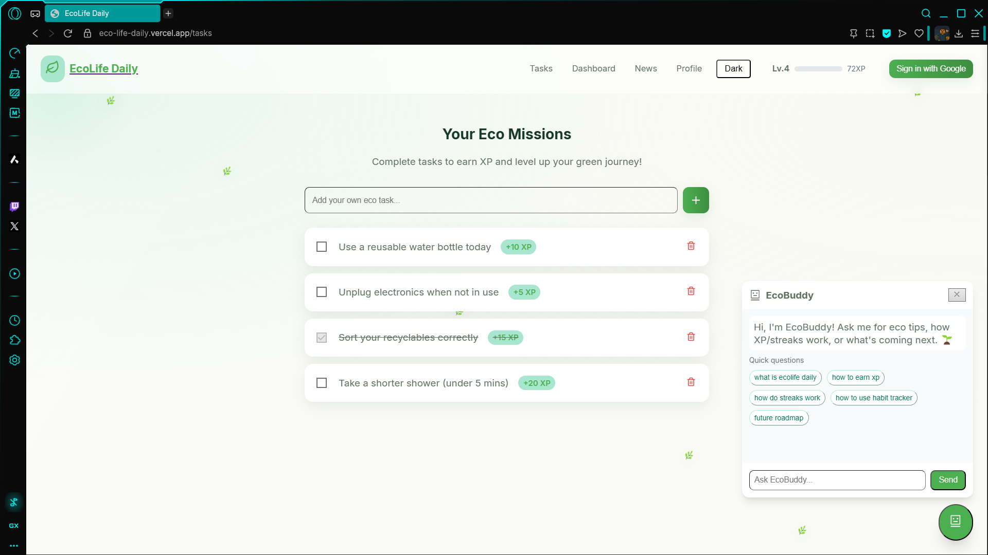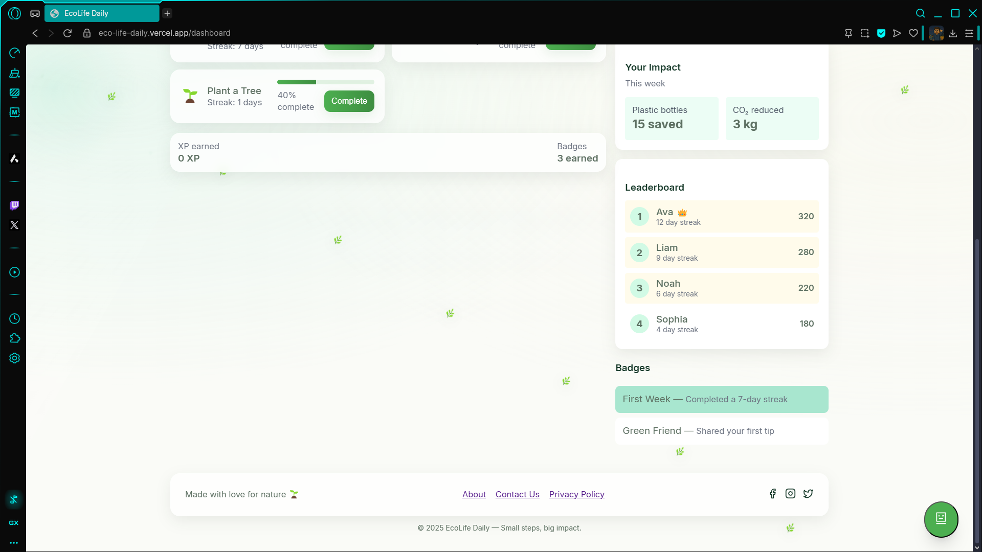 - Gamification: XP, streaks, and growth tied to eco-actions