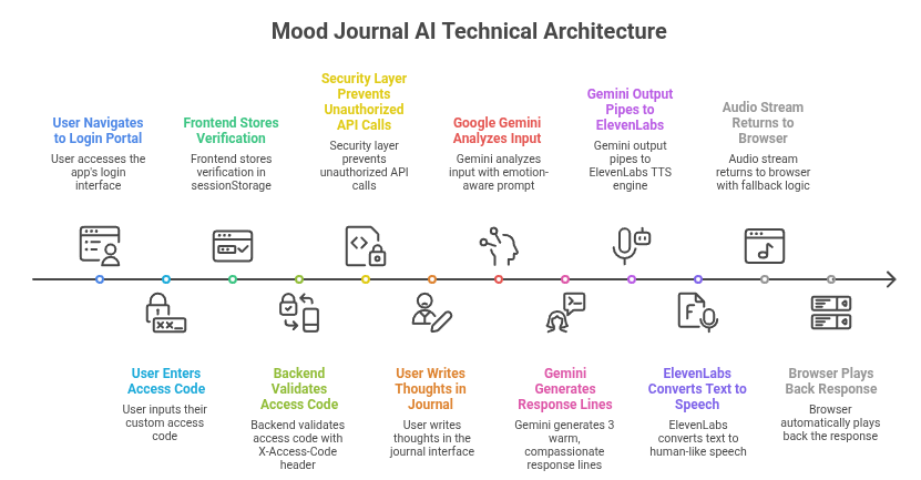 1.) The Brains: I used Google Gemini 1.5 Flash to do the heavy lifting for the sentiment analysis. It’s fast enough to feel like a real conversation. 2.) The Voice: I integrated ElevenLabs to handle the speech. I didn't want a robotic voice; I wanted something that sounded empathetic. 3.) The Glue: The whole thing runs on a Node.js backend that connects the frontend to the AI models. 4.)The Look: I designed a "Glassmorphic" dark-themed UI. It’s clean, modern, and easy on the eyes for late-night journaling.