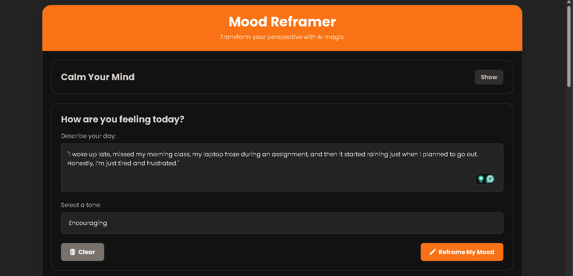 In our fast-paced lives, it’s easy to get caught up in negative thought patterns. A tough day can quickly spiral, impacting our mental well-being. I was inspired to create a tool that acts as a friendly, non-judgmental space for users to pause, reflect, and gently reframe their perspective. The goal of Mood Reframer is to provide a simple, accessible, and private way to practice mindfulness and build emotional resilience — making mental wellness support available to everyone.