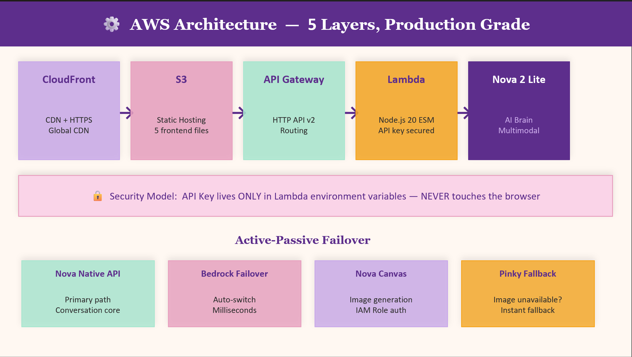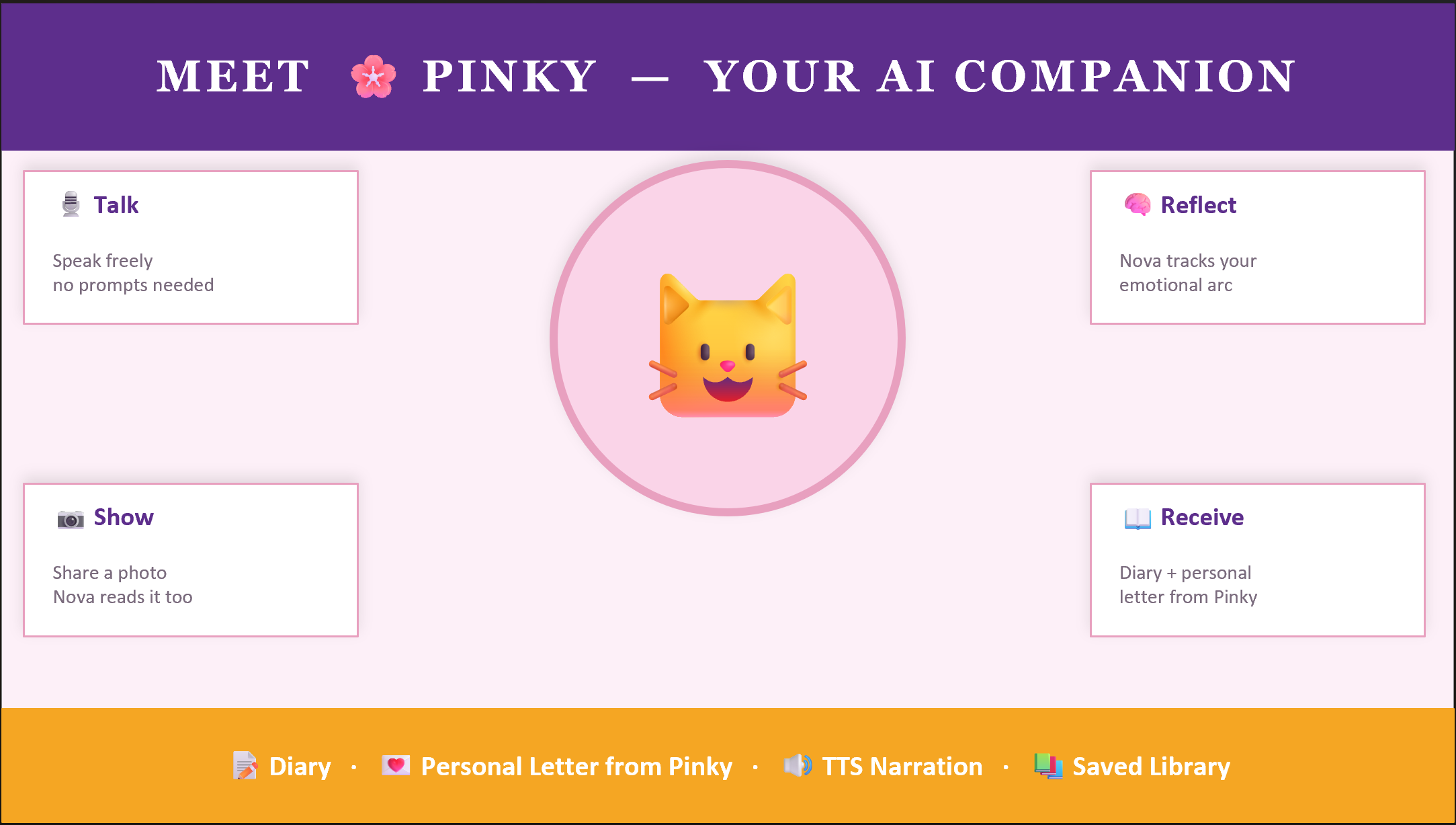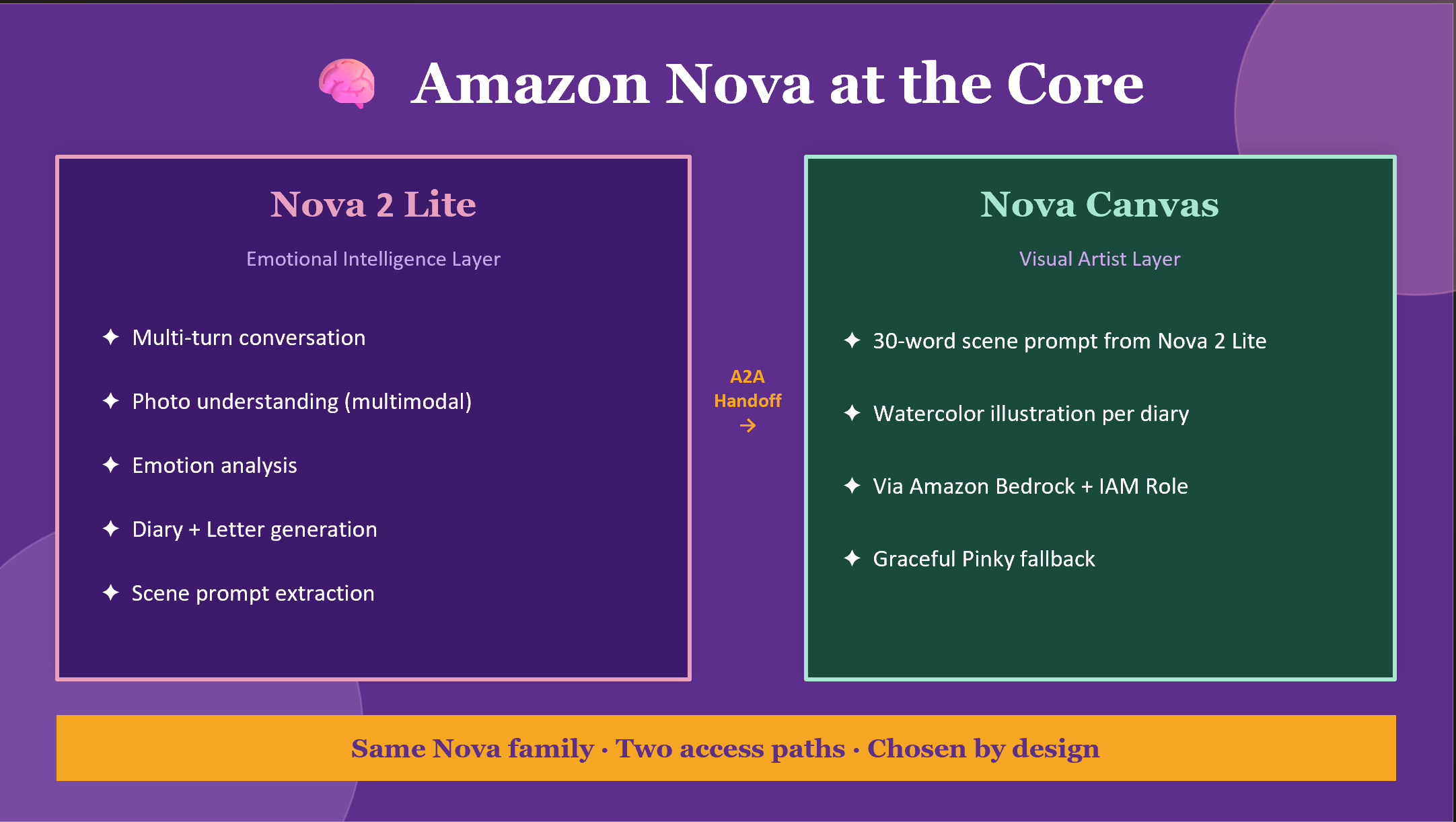 This is an AI-to-AI creative handoff within the Amazon Nova ecosystem — not a single model doing everything, but a choreographed handoff where Nova 2 Lite acts as director and Nova Canvas acts as visual artist. The result: five modalities in one session — voice input, image input (photo understanding), text output (diary + letter), image output (AI illustration), and voice output (TTS reading). The illustration pipeline includes graceful resilience: if Nova Canvas is unavailable for any reason, a pre-saved Pinky image appears instantly. The user never sees a broken image. Ever.