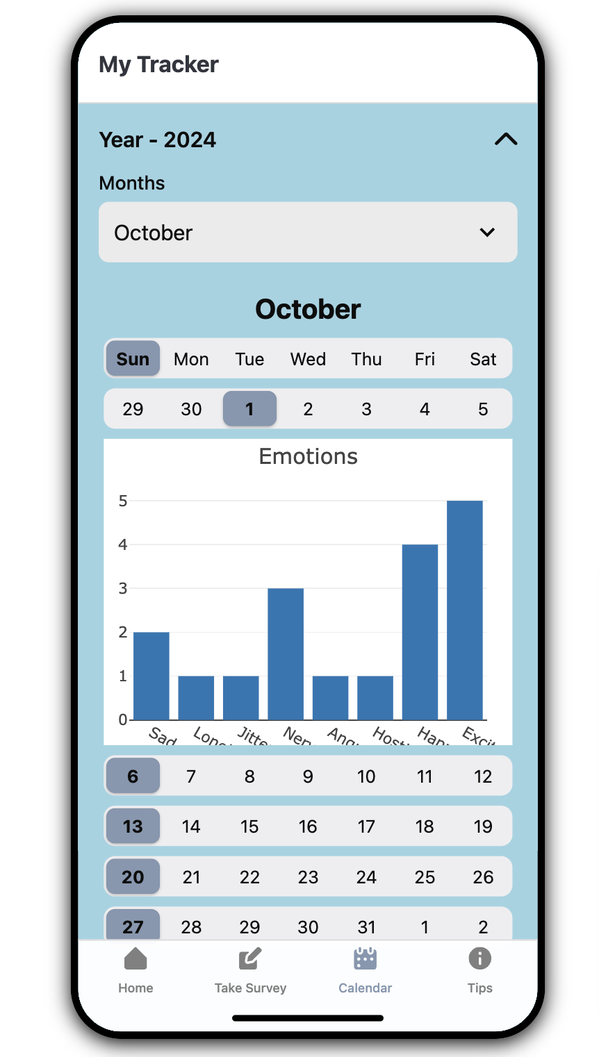We also add a “Calendar” interface for users to review their past responses and statistics, just like reading a personalized ‘mood diary’. The top header specifies the current year “2024” and a dropdown below it from “January” through “December” allows users to select the month they want to view. After they’ve made a selection, a corresponding calendar for all the days in that month appears on the screen, and users can click on each date to view their past statistics for that day as a “pop-up” display. In the future, we also want to display summary statistics for a time period of the user’s choice (e.g. mean values for each emotion across a period of time) and graphs tracking changes in their emotions over time. One challenge we encountered when implementing the Calendar feature is that Retool, the platform we’re using to build our app, doesn’t have a calendar component for mobile apps ready for use. We also tried building a calendar in HTML and JavaScript, but that also didn’t render properly because Retool doesn’t seem to support custom or inline CSS for mobile app development. As a workaround, we used horizontal tab components to mimic the appearance of a calendar for each month and linked each tab to show a “pop-up” display for the data of that date. For now, we’ve only made the complete interface for October 1st and 2nd as example demonstrations, but calendar displays for other months and dates should look similar.
