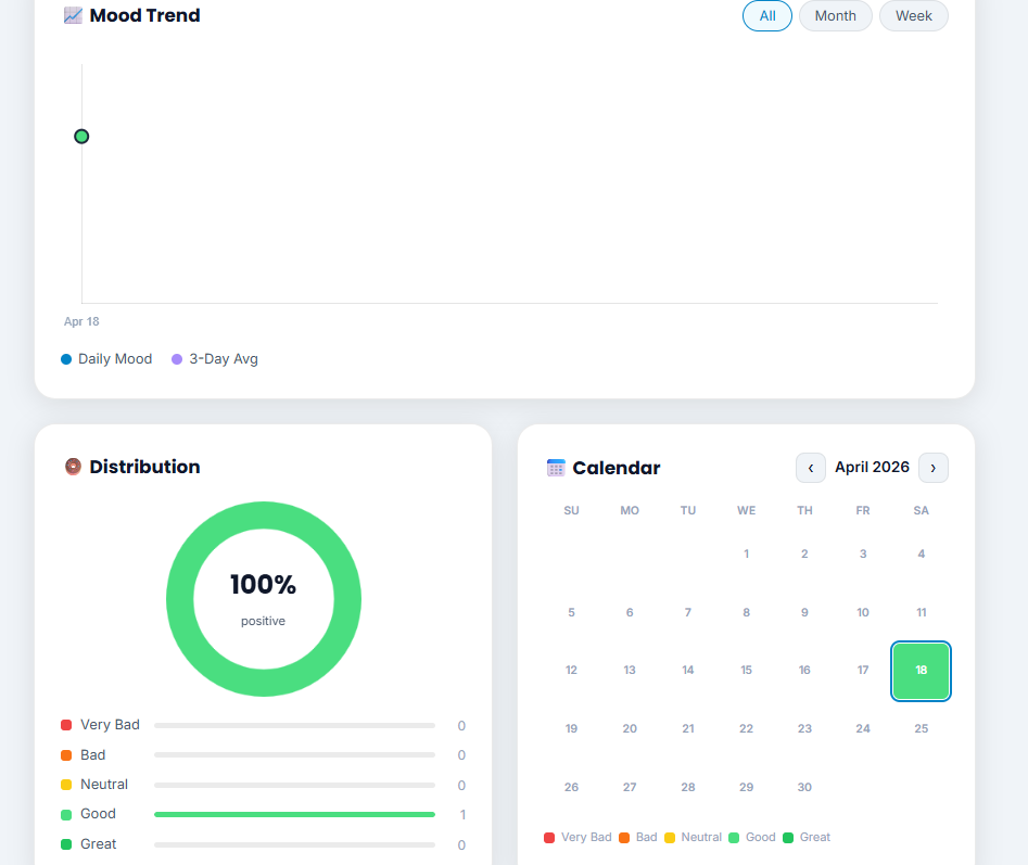 Mental health is something many people struggle with, but tracking it consistently is often difficult. Most tools are either too complex, too time-consuming, or require constant input that people eventually stop using. I wanted to build something extremely simple—open it, log how you feel in a few seconds, and move on—while still gaining meaningful insights over time.