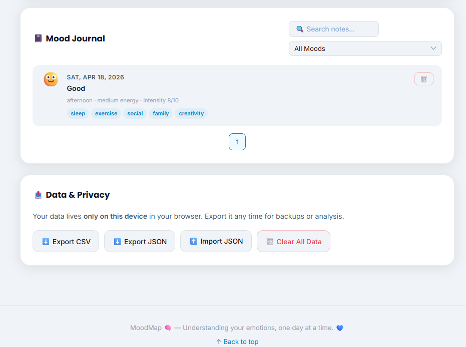 It also identifies patterns such as streaks of good or low moods, overall mood variability, and long-term trends. Users can view their personal mood history as a journal and export all their data as CSV or JSON for full ownership and portability.