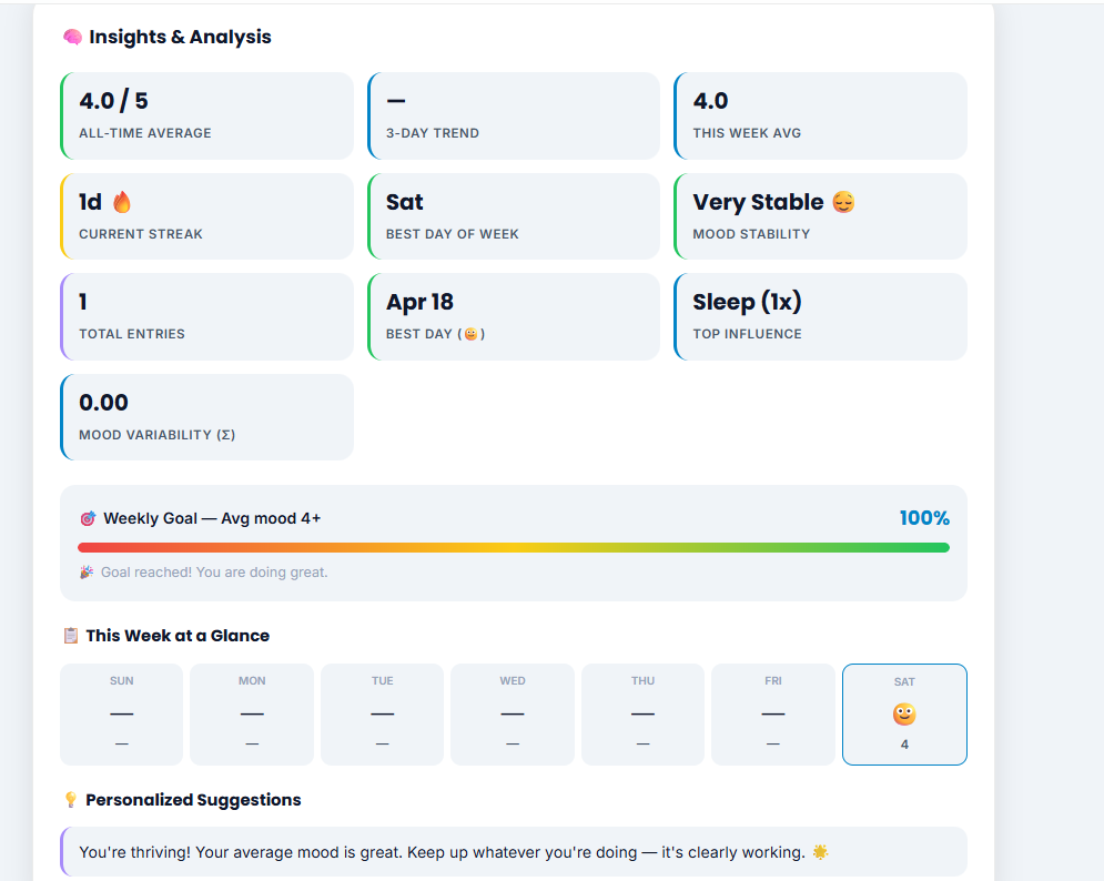 To generate insights, I implemented simple analytics such as averages, streak tracking, and trend detection. One key metric used in the app is mood variability, calculated using standard deviation: