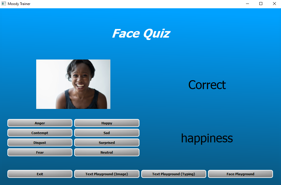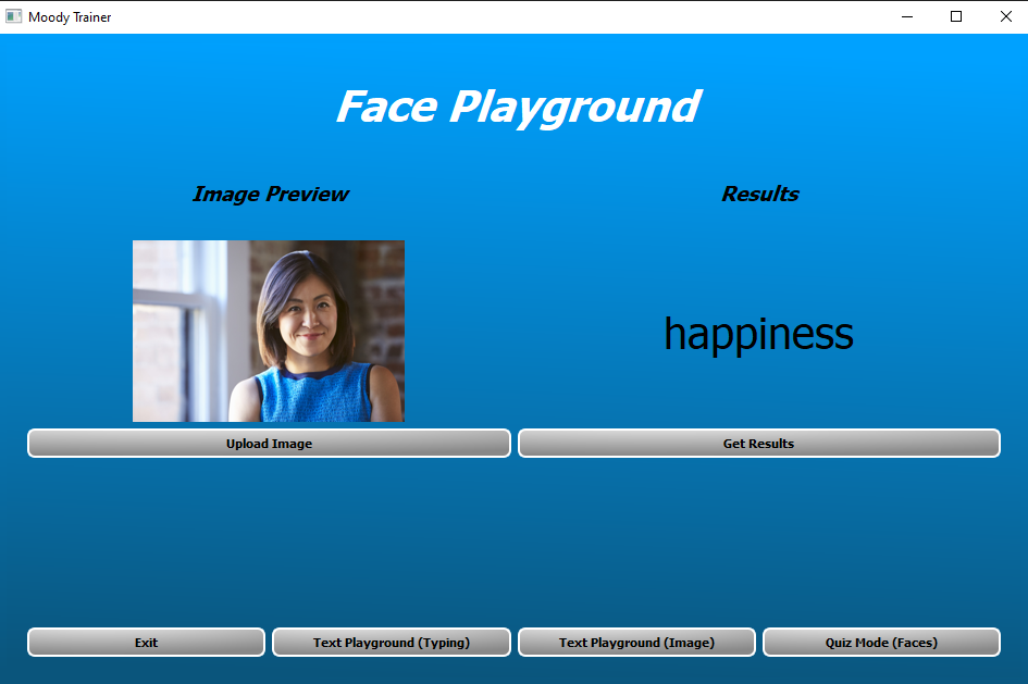 MoodyPy does one of 4 things, it allows users to play around with custom images for facial emotion recognition, play around with custom text images for image to text sentiment analysis, type up custom sentences for sentiment analysis, and small quiz-like interface to test the user's ability to identify facial expressions based off a randomized face.