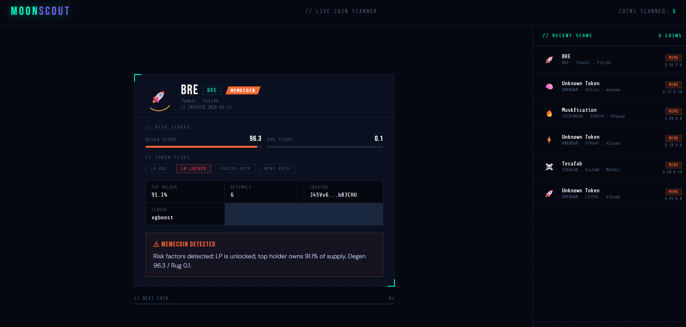 If they are memecoins, they get displayed on our web app for users to see in real time. The app will also display stats about each coin which are used to detect their legitimacy, such as the coin's volatility and how much share in the coin the top holder has (higher values -> more likely to be a memecoin).