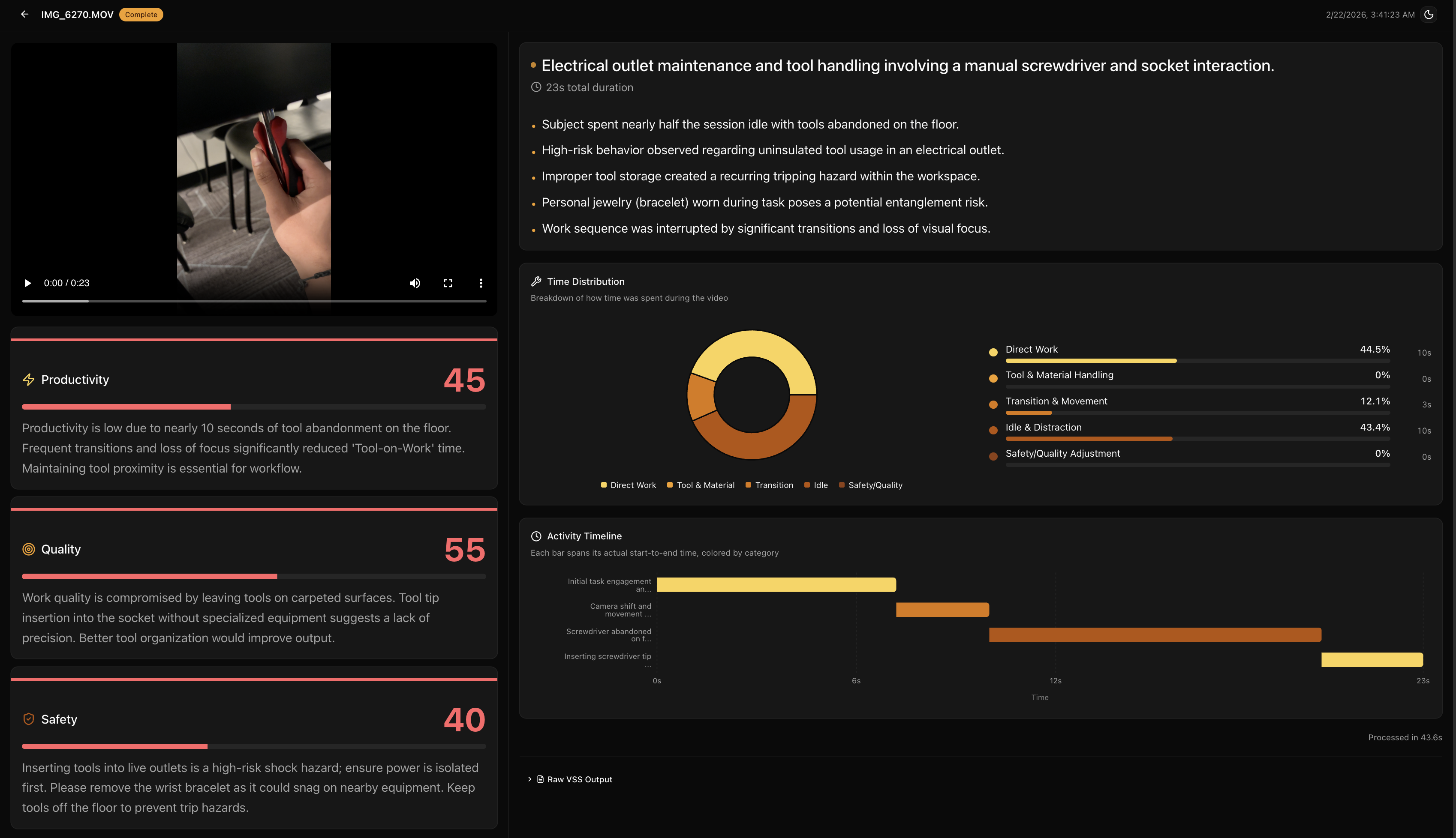 - Today, construction sites collect hours of POV video footage daily, but supervisors are still required to manually sort through and analyze productivity and safety data. We were inspired by one question: How can we automatically turn raw footage into a structured report for supervisors? We know AI can describe what it can see; however, it struggles to convert that information into measurable, applicable, and time-based insight. Our goal was to bridge that gap and transform passive footage into superior-ready reports.