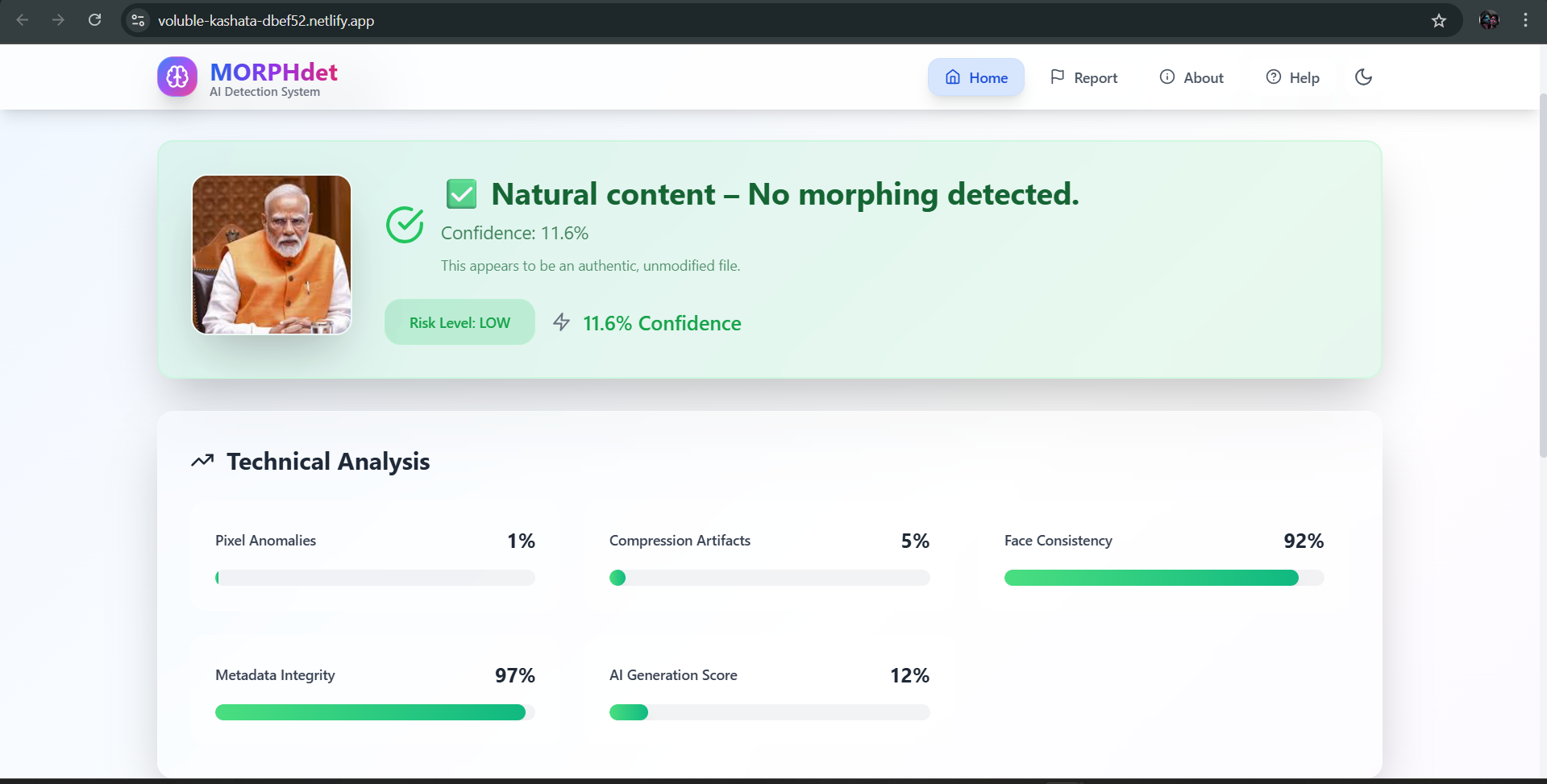 MORPHdet allows users to upload an image or video (up to 15MB) and analyze it for manipulation. It checks whether the content is: