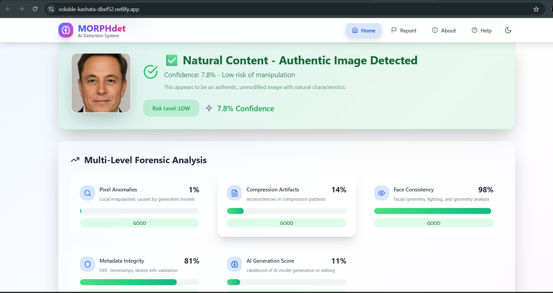 I built MORPHdet using Bolt, which allowed me to create the interface and detection flow without coding from scratch. I deployed the app using Netlify. The detection logic is designed using structured prompts that simulate multiple forensic layers — including AI signature detection, metadata analysis, and facial structure analysis. I kept the design lightweight, fast, and accessible.